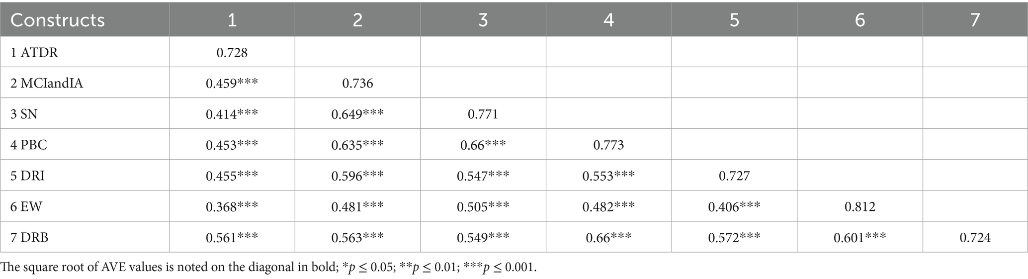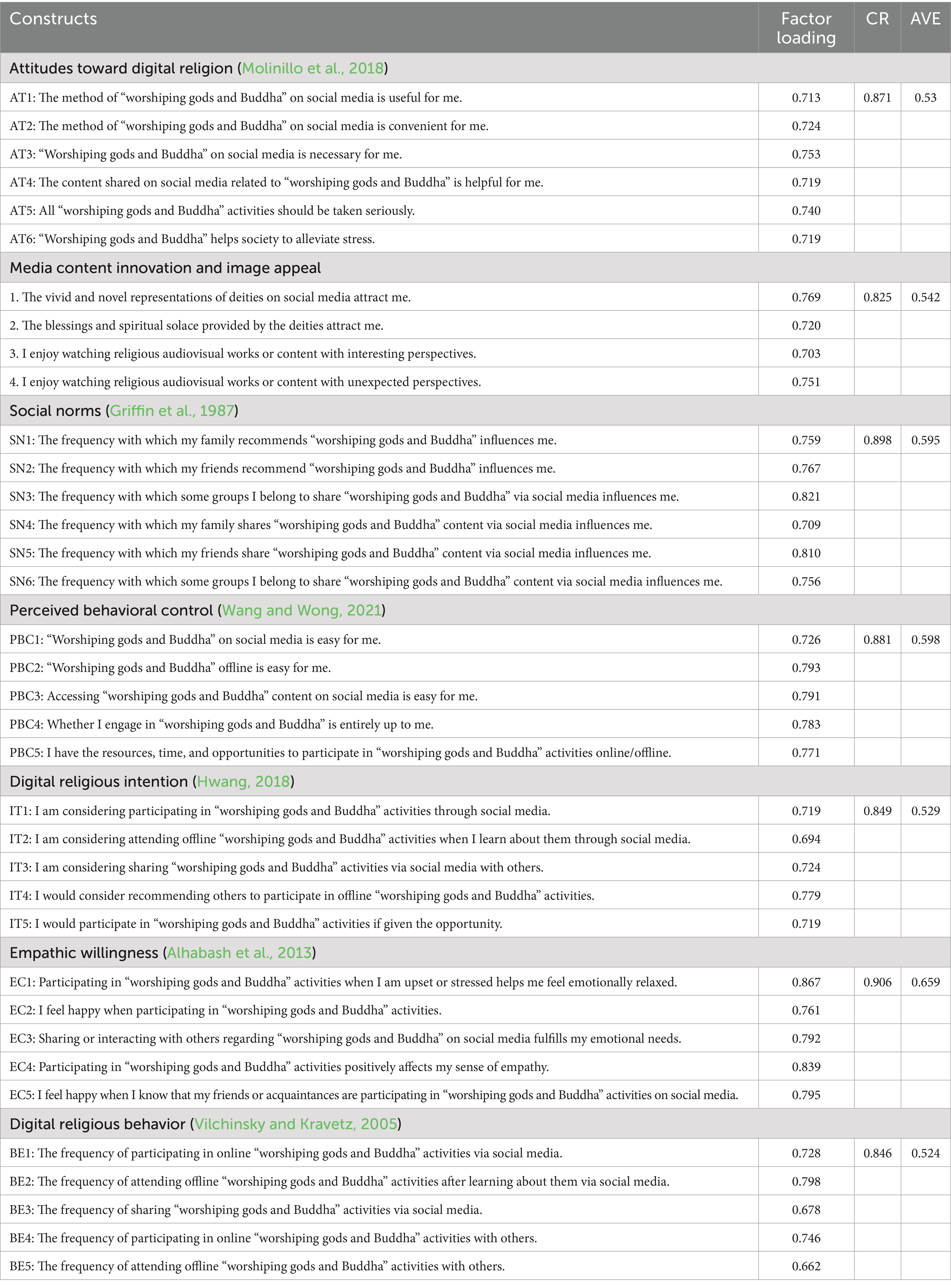 To mitigate common method bias (CMB), which can arise when data are collected using a single method (e.g., self-reported questionnaires), several procedural and statistical strategies were employed, following recommendations by Podsakoff et al. (2003). Procedurally, the questionnaire was designed to ensure respondent anonymity, reducing social desirability bias. Clear instructions emphasized that there were no right or wrong answers, encouraging honest responses. Items were randomized to avoid order effects, and different response scales were used for different constructs (e.g., frequency-based for subjective norms, likelihood-based for digital religious intention) to minimize response pattern biases. Statistically, Harman’s single-factor test was conducted to assess CMB. The results showed that the first factor accounted for only 32.4% of the total variance, well below the 50% threshold, suggesting that CMB was not a significant concern. Additionally, the high Cronbach’s alpha and composite reliability (CR) values (all > 0.8) and adequate average variance extracted (AVE) values (> 0.5) for all constructs (see Table 1) further indicate that the measurement model was robust and not unduly influenced by CMB.