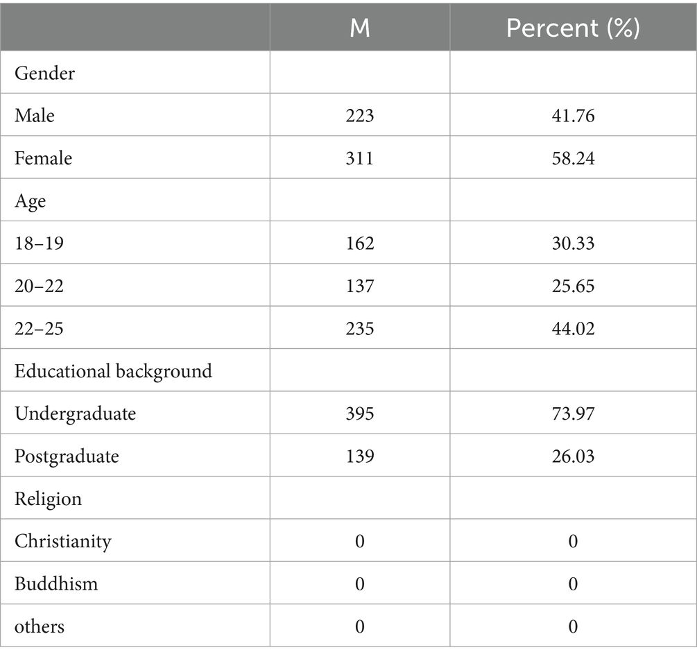 This study employed a purposive sampling approach to target Chinese Generation Z social media users, specifically those active on Weibo and TikTok, as these platforms are among the most popular among this demographic in China. A questionnaire survey was distributed to 30,000 qualified internet users (15,000 Weibo users and 15,000 TikTok users) using the “@” function on Weibo and the private messaging function on TikTok. Participants were invited to complete the survey if they met the inclusion criteria: being born between 1997 and 2012 (Generation Z) and actively engaging with religious or spiritual content on these platforms. To incentivize participation, respondents were offered 30 RMB (approximately 4.80 USD) as compensation. A total of 576 users provided valid responses, and after excluding incomplete or invalid submissions (e.g., responses with missing data or inconsistent answers), the final sample consisted of 534 valid questionnaires (223 males, 311 females), yielding an effective response rate of 92.53%. According to Ding et al. (1995), a sample size of 100 to 150 is sufficient for structural equation modeling (SEM) analysis. The sample size of 534 exceeds this threshold, ensuring robust statistical power for the analyses conducted.