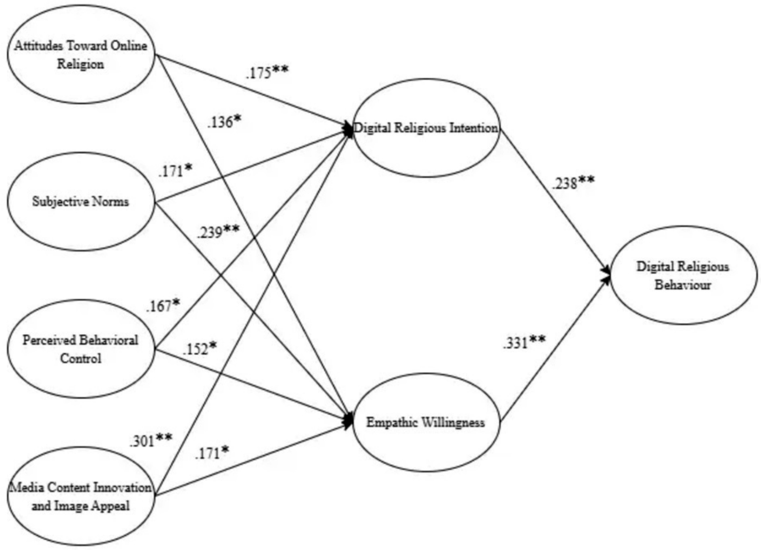 Findings indicate that media content innovation and empathic willingness significantly enhance digital religious behavior within the TPB framework. Vibrant, emotionally resonant content on social media platforms fosters emotional engagement and active participation, amplifying religious intentions among participants.