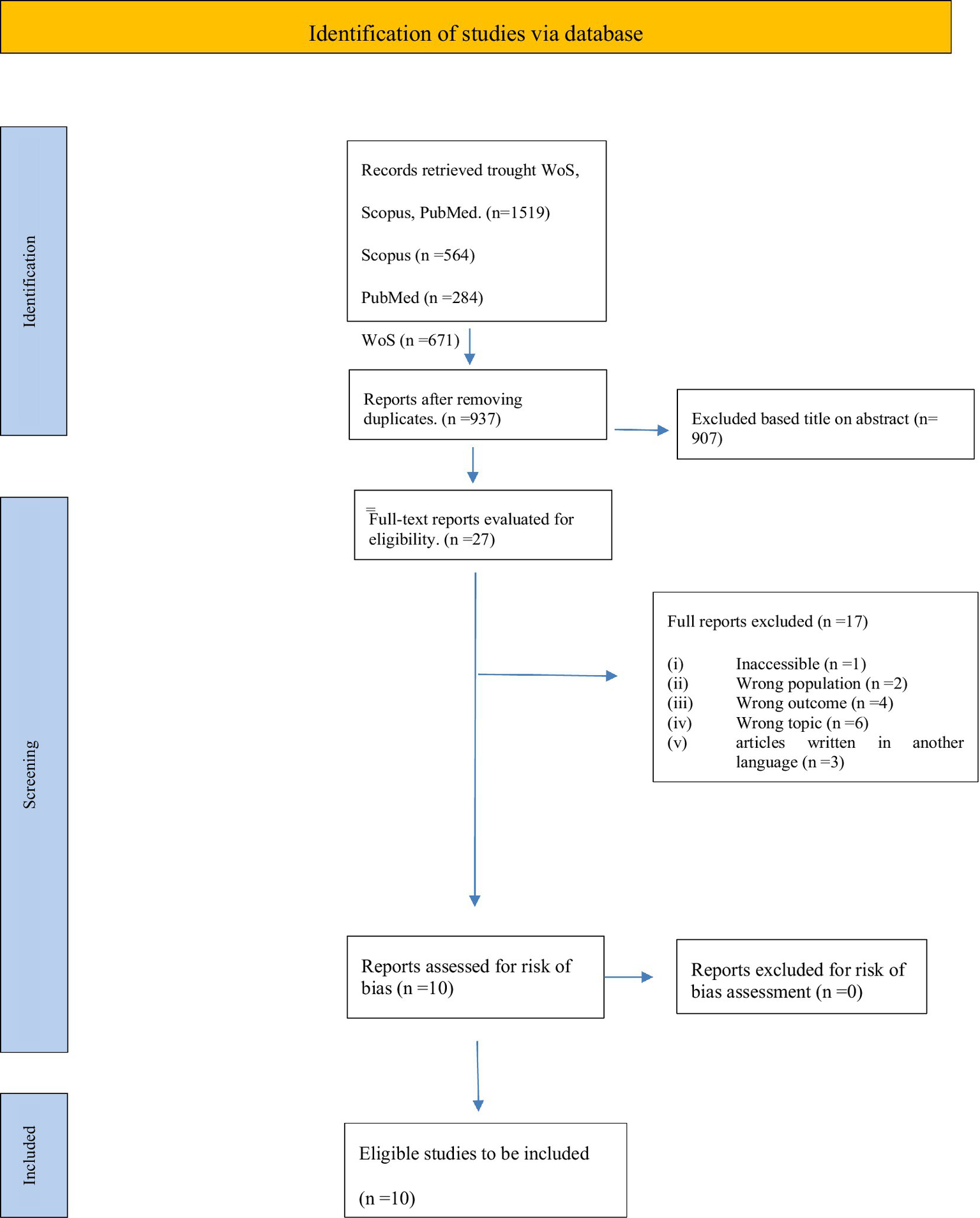 The initial search identified a total of 1,519 articles. After excluding duplicate studies, screening for relevant topics and reading abstracts and full texts, 27 articles were found to meet the study criteria. Of these, 10 studies were included in the qualitative analysis. The study selection process is presented in the PRISMA diagram (Figure 1), which illustrates each stage of the screening process, including the reasons for excluding articles at each stage.