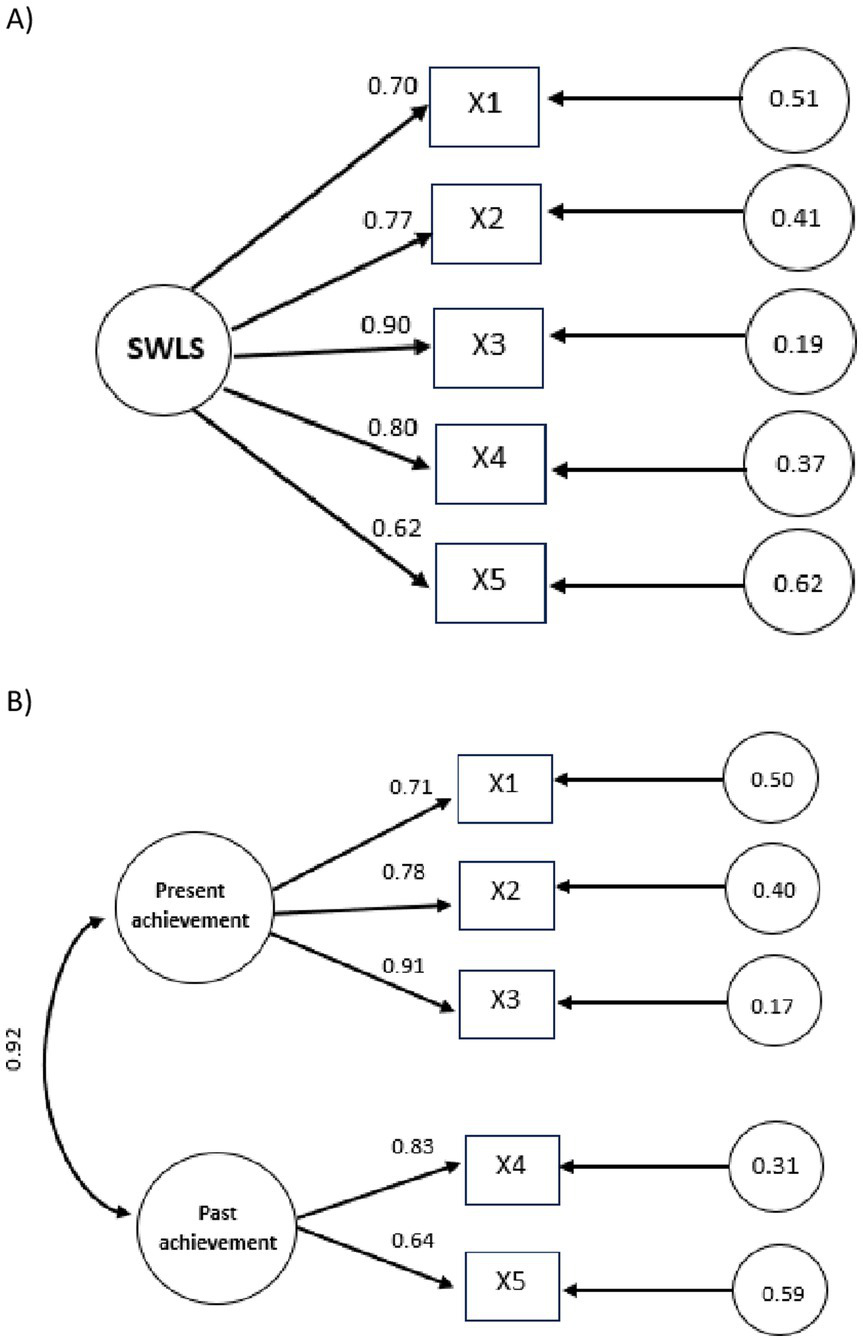 To determine the factor structure of the scale, the goodness-of-fit indices of two different models were compared: (1) One factor, based on the results obtained in the EFA and the consistent results in the CFA of several previous studies including the original author of the scale and his collaborators (Diener et al., 1985), and (2) two factors, satisfaction with life with present achievements (items 1, 2 and 3) and past achievements (items 4 and 5) reported by Bagherzadeh et al. (2018), Pavot and Diener (1993) and Sachs (2003).