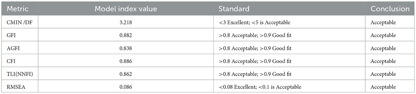The composite reliability (CR) and average variance extracted (AVE) should be ≥0.7 (> 0.6 is acceptable) and ≥0.5 (>0.3 is acceptable), respectively. Fornell and Larcker believed that the AVE is not an absolute standard, and the scale can still have good aggregate validity when the AVE is slightly less than 0.5 and the composite reliability (CR) exceeds 0.6 (Fornell and Larcker, 1981). When the AVE value is greater than 0.36, this is an acceptable state, and >0.5 is the ideal state (Kline, 2023).