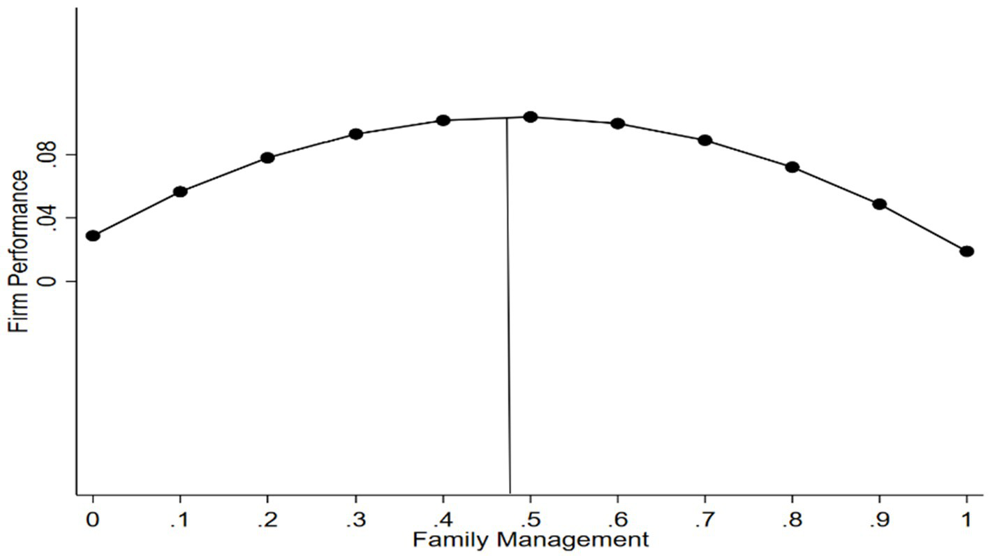 Hypothesis 1: There will be an inverted U-shaped relationship between family management and firm performance, that is to say, where the extent to which non-economic goals are positively related to economic goals up to a point, after which it becomes negative.