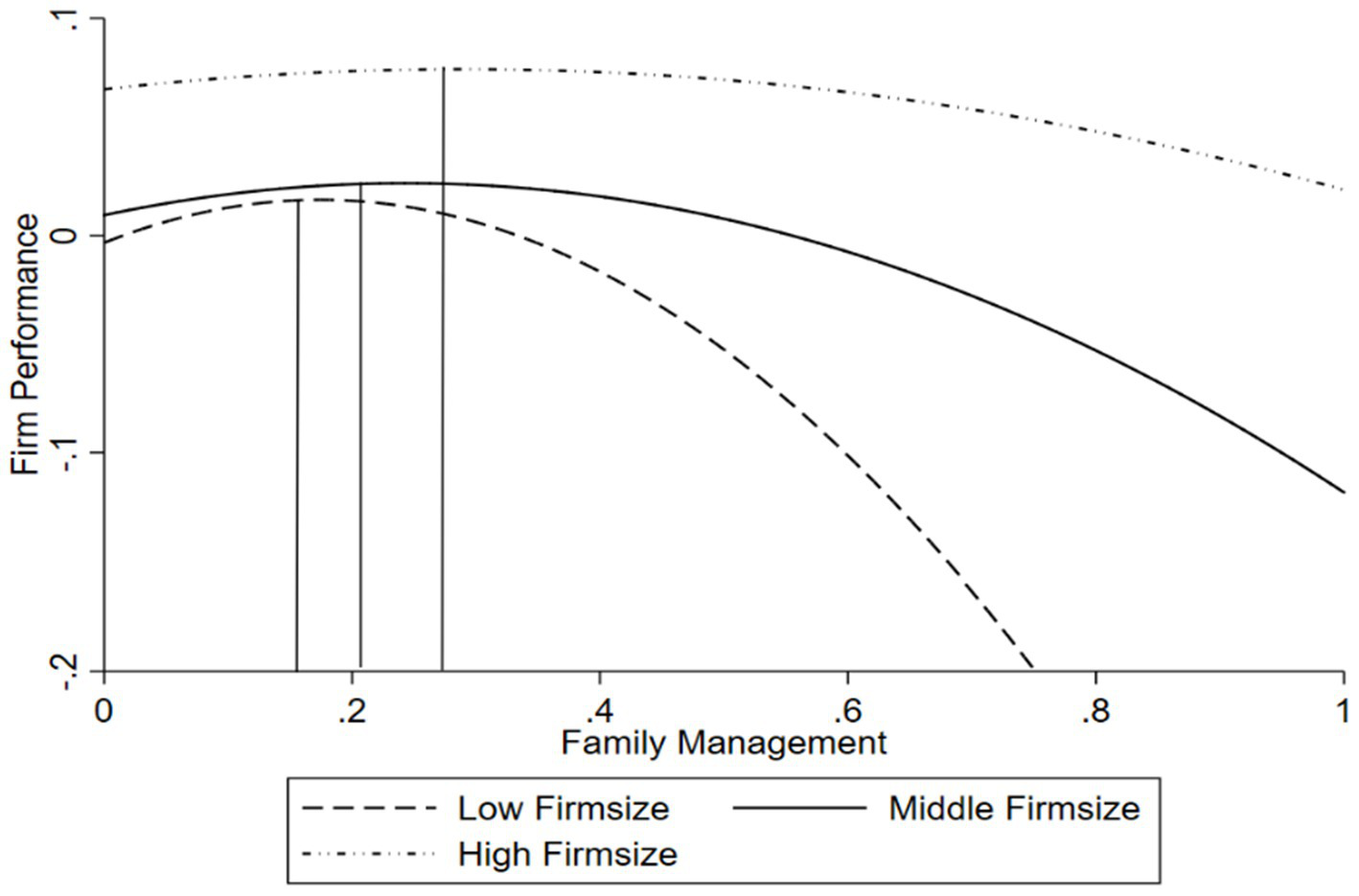 Hypothesis 2: Firm size moderates the inverted U-shaped relationship between family management and firm performance, such that at larger firms, the inverted U-shaped becomes flatter, and the turning point shifts to the right.
