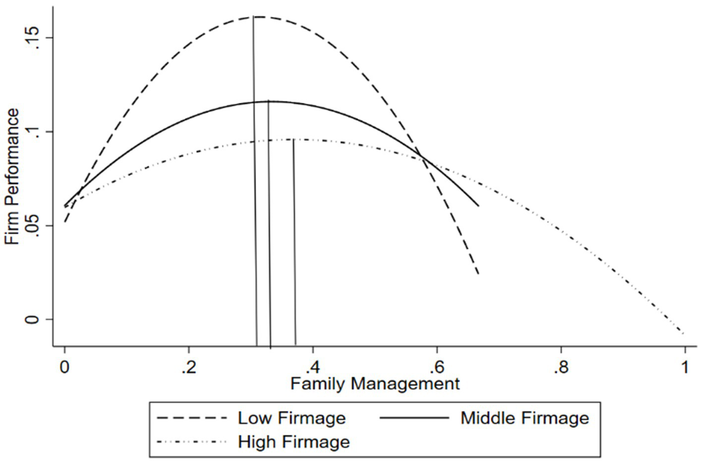 Hypothesis 3: Firm age moderates the inverted U-shaped relationship between family management and firm performance, such that at larger firms, the inverted U-shaped curve becomes flatter, and the turning point shifts to the right.
