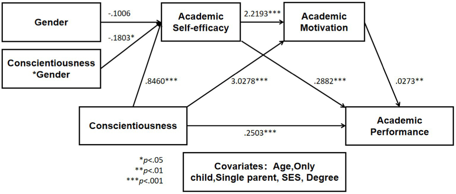 In the field of educational psychology, the exploration of predictors of academic performance (AP) has an ongoing history (Lavin, 1965). More recently, as research on the Big Five theory of personality has deepened, conscientiousness was repeatedly verified to be a solid contributor to AP (Trautwein et al., 2009). Meanwhile, other concepts of cognitive psychology, such as academic self-efficacy (ASE) and academic motivation (AM), also facilitated the further explanation of AP. However, insufficient research was able to elucidate the causal relationships among conscientiousness, ASE, AM, and AP within the framework of moderated mediation models. The lack of clarity about the causal relationships among these important variables will further hinder the development and application of effective educational interventions. In this case, it is urgent to clarify the relationships among these variables, and the purpose of this study is to explore the moderated mediation effect between AP and its main contributors.