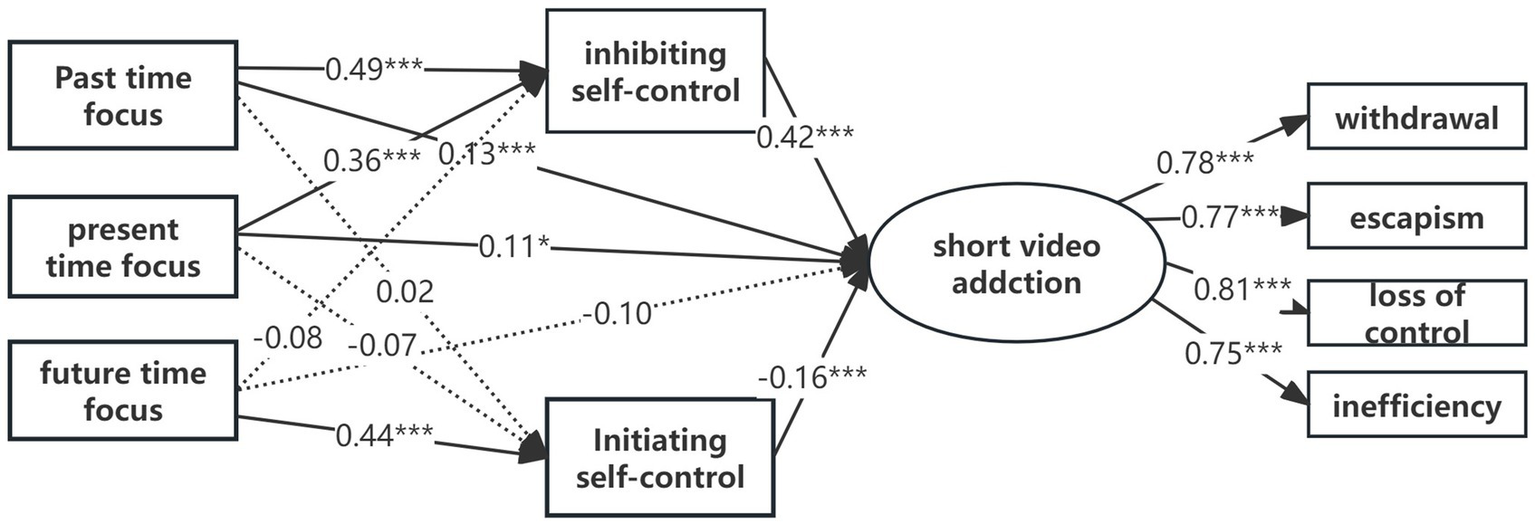 Relationships between different time focus, inhibiting self-control, Initiating self-control, and short video addiction. The dotted line represents non-significant relationship. ***p < 0.001, *p < 0.05.