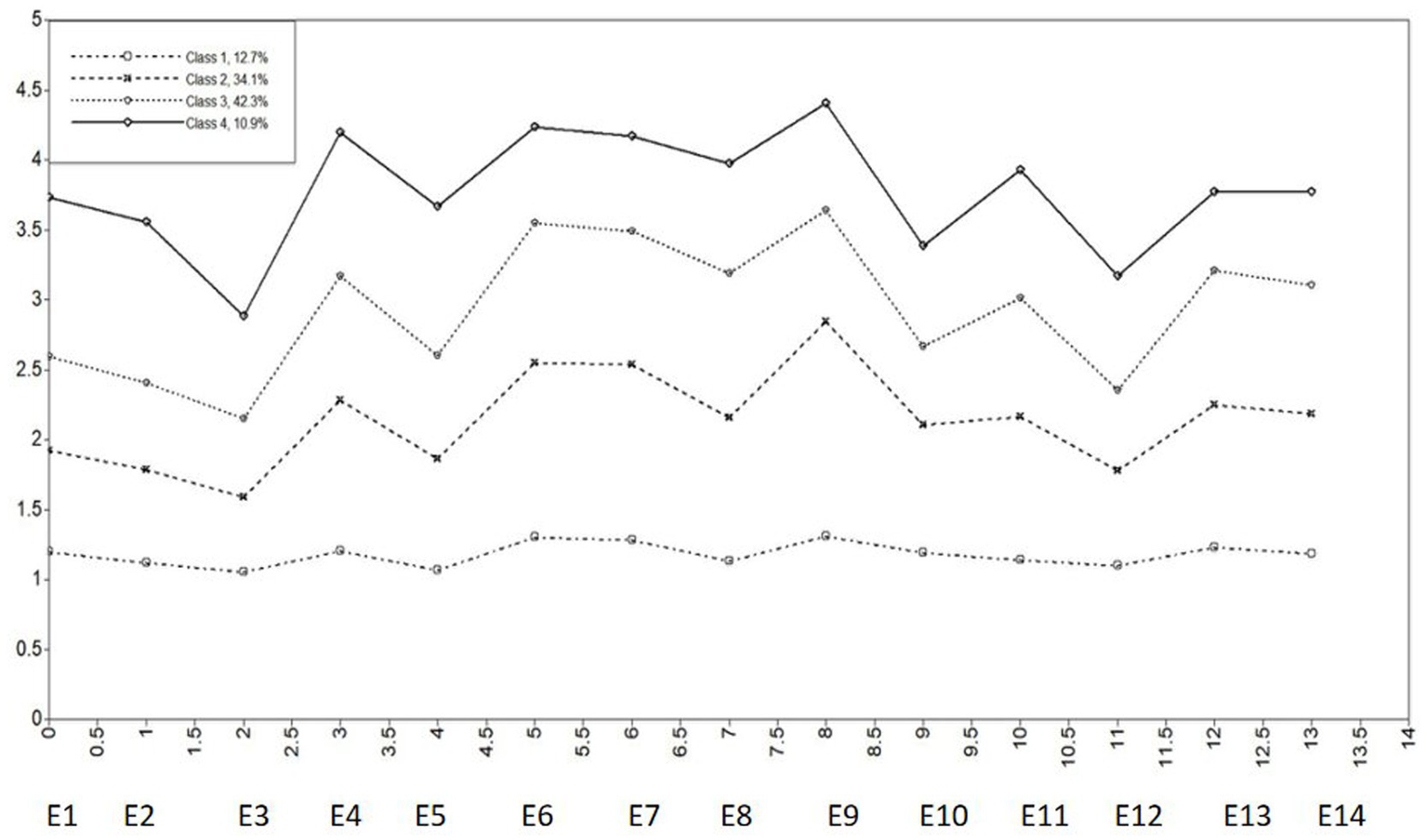 Latent profile analysis of short video addiction: Four-profile solution. E1–E14 = items 1–14 of the short video addiction scale.