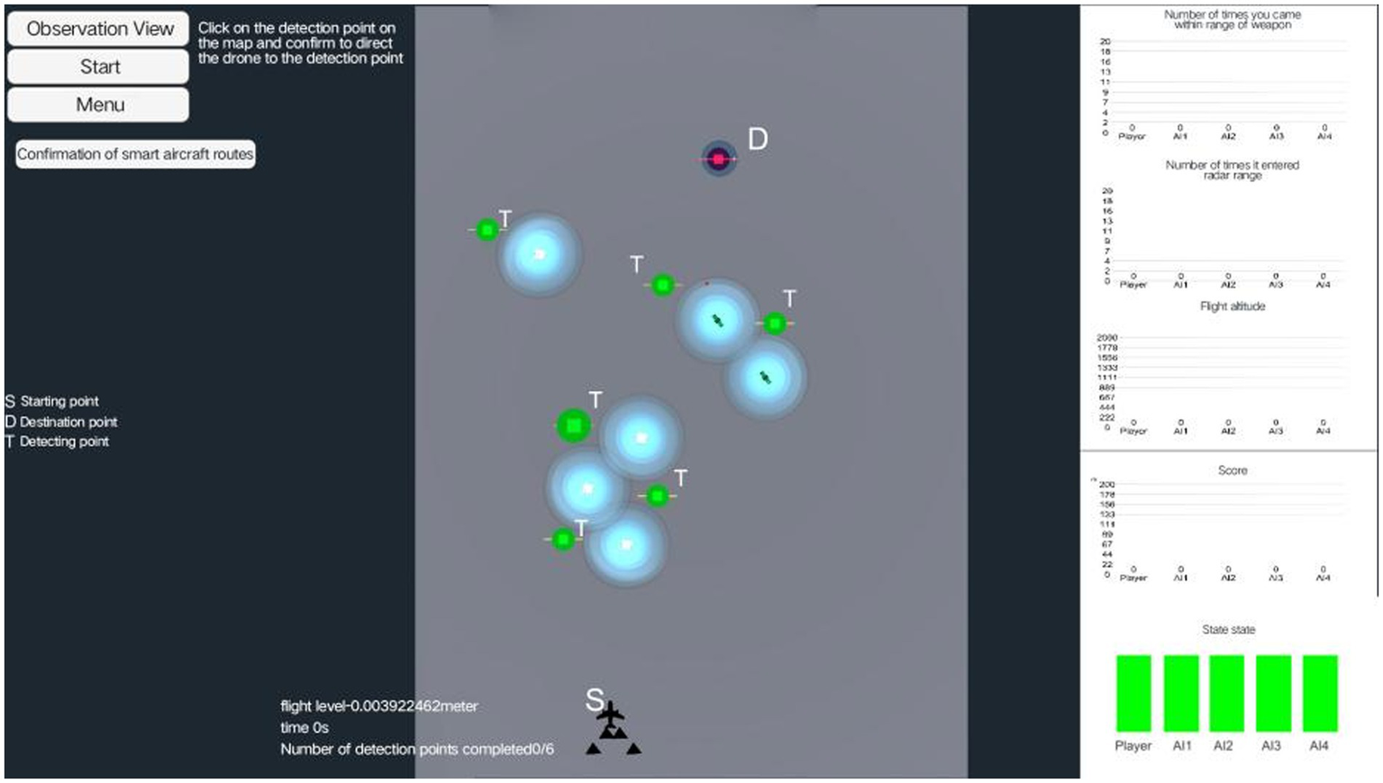 The experimental screen setup was illustrated in Figure 2. In this setup, “S” represented the MAV’s starting point, “D” represented the destination, “T” represented the detection points, and the blue area near each detection point indicated the danger zone. The primary objective of the experiment was to start at “S,” detect all “T” points while avoiding the danger zones, and finally reached “D.” During the detection task, real-time data for the MAV—including altitude, time, and the number of detected targets—were displayed at the bottom of the screen, while real-time data for the UAVs appeared on the right side. The MAV under test can collaborate with the UAVs to accelerate task completion by jointly detecting all designated points. If the participant wanted the UAVs to detect a specific point, they can click on that detection point with the mouse, which would display the “Confirm Intelligent Route” button on the right side of the screen. By clicking this button, the UAVs would automatically proceed to detect the selected point.