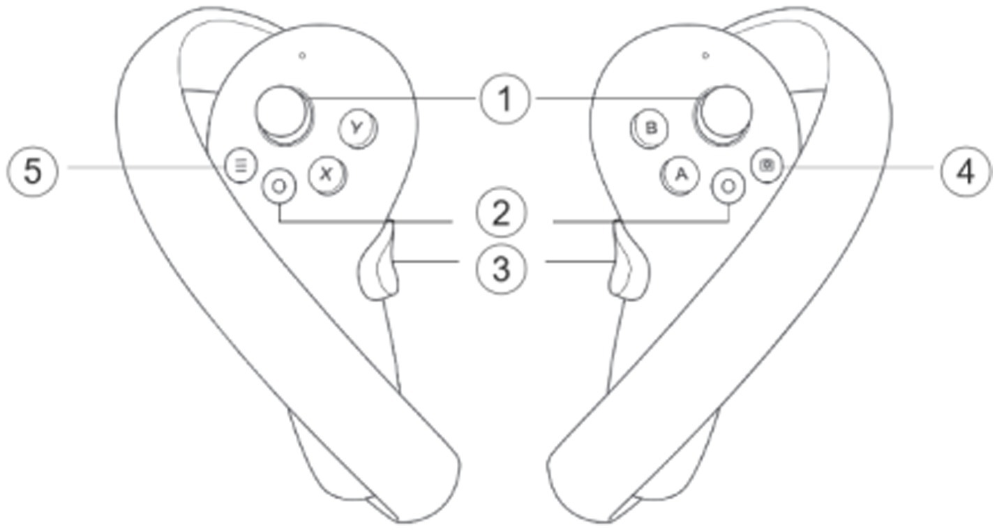 Schematic diagram of the operation of the VR end handle, 1 is the joystick, 2 is the Home button, 3 is the grip button, 4 is the cutoff button, 5 is the menu button.