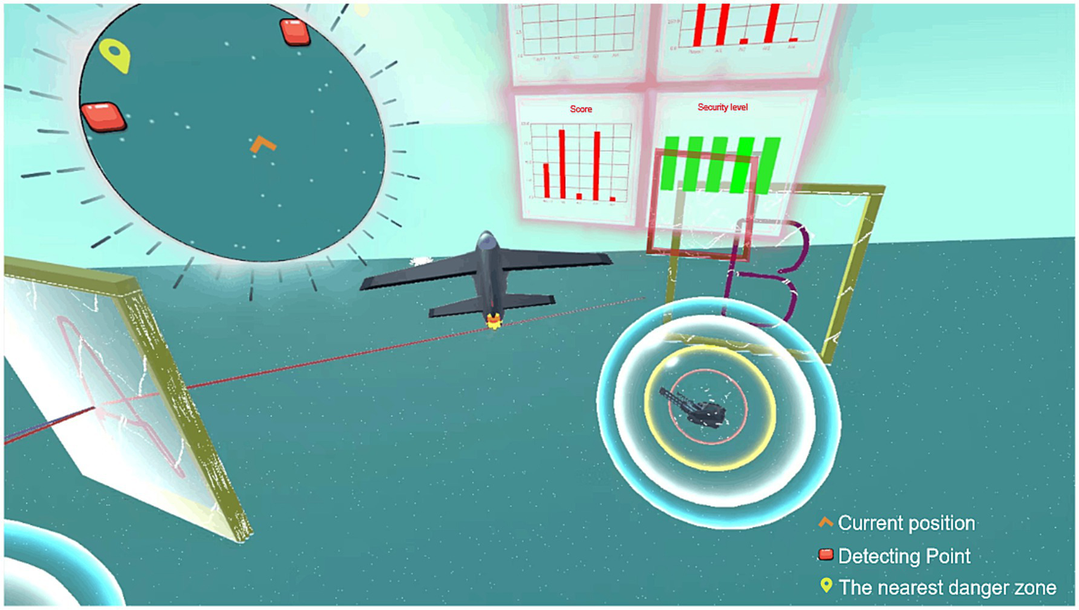 The experimental setup consists of one manned aerial vehicle (MAV) and four UAVs, each utilizing deep reinforcement learning algorithms for path planning, obstacle avoidance, and flight control. This design enables an in-depth investigation of how personality trait and contextual factors influence the development of trust across multiple dimensions, including static and dynamic trust. The experiment takes place in a virtual environment featuring multiple detection points. Each detection point is represented as a rectangular box, and the drones are required to detect these points. Upon successful detection, the box changes color, signaling task completion. To introduce complexity and risk, radar systems continuously monitor the surrounding airspace for unauthorized objects in designated “danger zones.” If a UAV enters a danger zone for a certain duration, it is deemed “exposed,” resulting in mission failure. Participants control the MAV, guiding it from the starting point through all detection points and ensuring it ultimately reaches the endpoint. If the MAV approaches or enters a danger zone, an alarm is triggered, requiring participants to make adjustments to prevent mission failure. The goal of the experiment is to complete the mission successfully by detecting all points, avoiding danger zones, and reaching the endpoint. To control experimental variables, the UAVs are equipped solely with surveillance functions, with all path planning and obstacle avoidance handled autonomously using deep reinforcement learning. This ensures that participants focus on collaboration rather than direct UAV control, isolating trust-related factors for analysis.