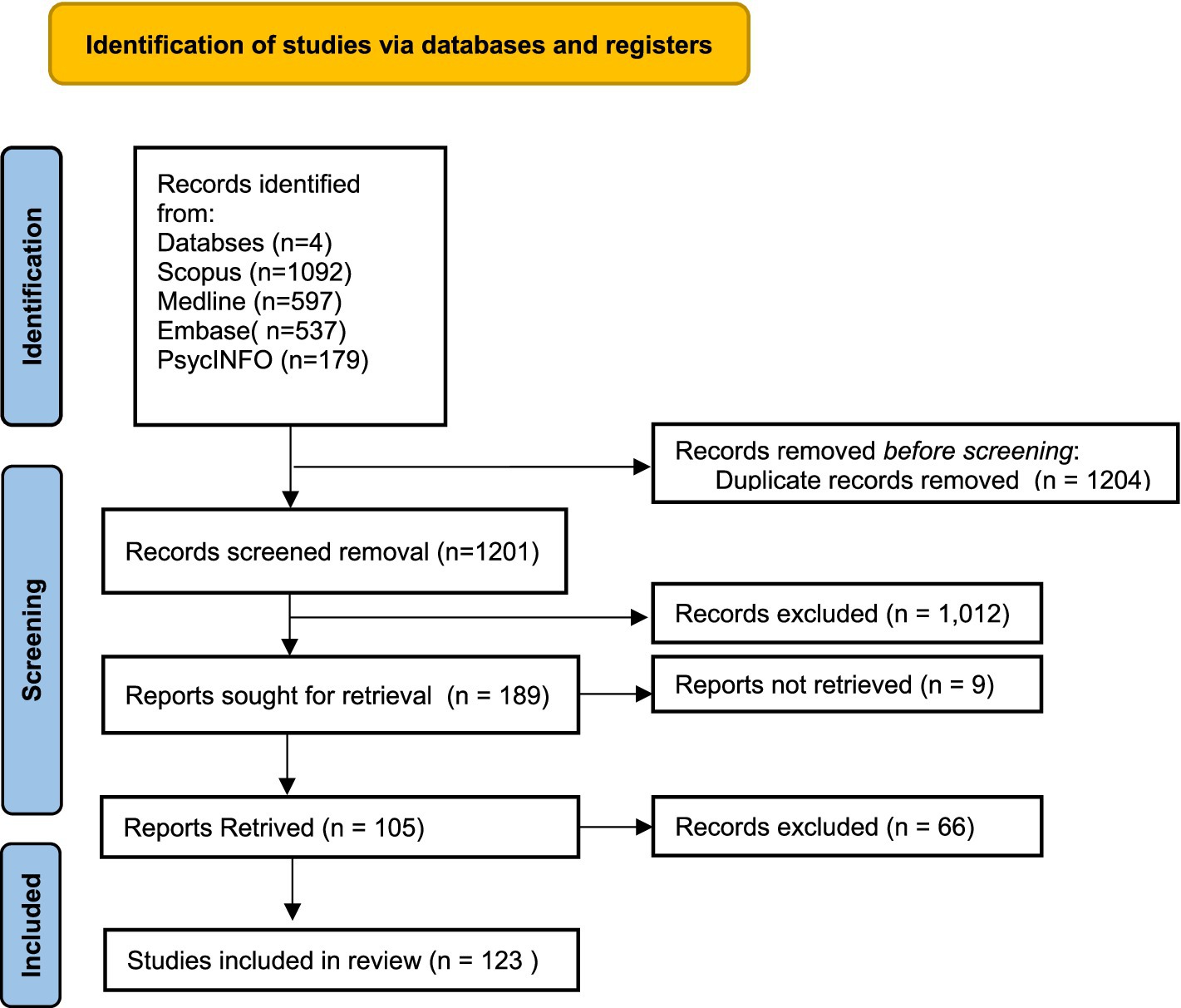 Flowchart detailing study identification and screening process. Records identified from four databases: Scopus (1,092), Medline (597), Embase (537), PsycINFO (179). After removing 1,204 duplicates, 1,201 records were screened. Of these, 1,012 were excluded, and 9 were not retrieved. From 189 sought reports, 105 were retrieved, with 66 excluded. Finally, 123 studies included.