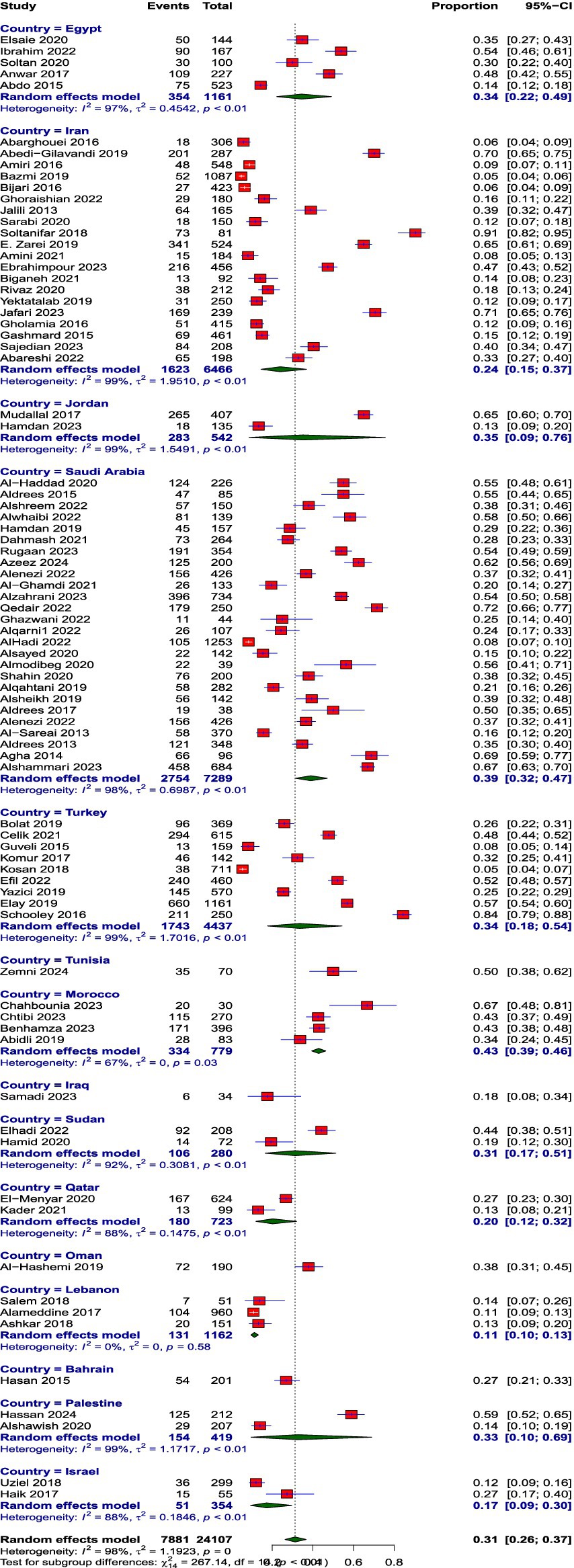 Forest plot illustrating the proportion and 95% confidence intervals of various studies on different countries. Each study is represented by a red square, indicating the estimated proportion, and horizontal lines denote confidence intervals. Green diamonds represent the combined random effects model for each country and overall. Countries include Egypt, Iran, Jordan, Saudi Arabia, Turkey, Tunisia, Morocco, Iraq, Sudan, Qatar, Oman, Lebanon, Bahrain, Palestine, and Israel. The plot displays heterogeneity measures and statistical values along the right side, spanning a range from 0.0 to 0.8.