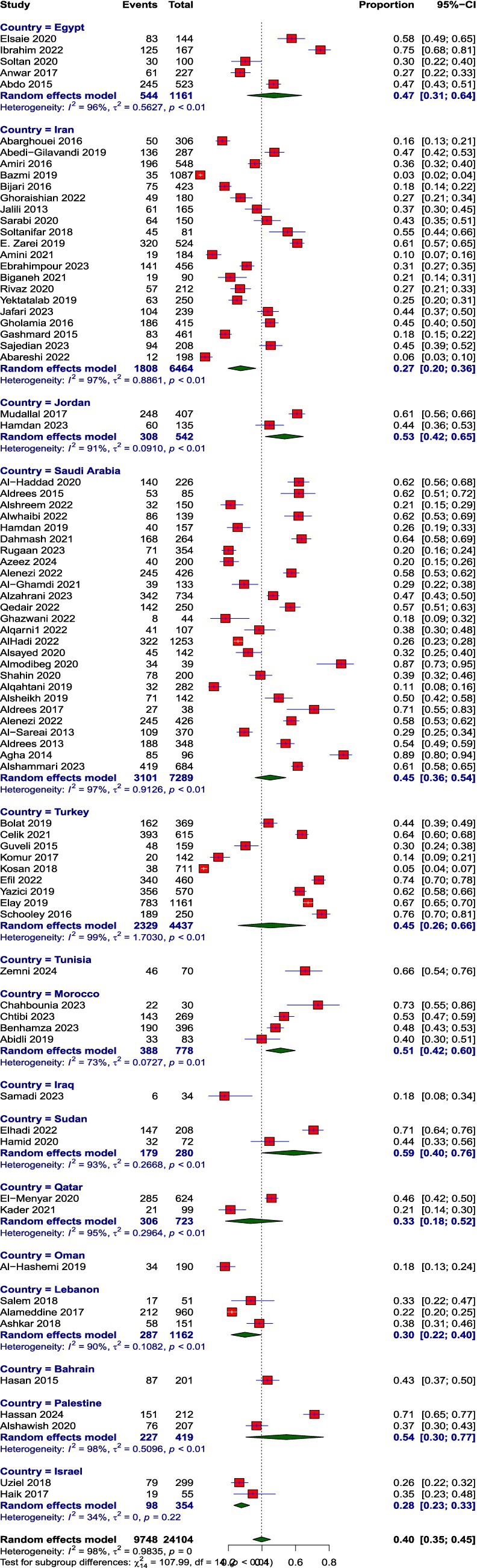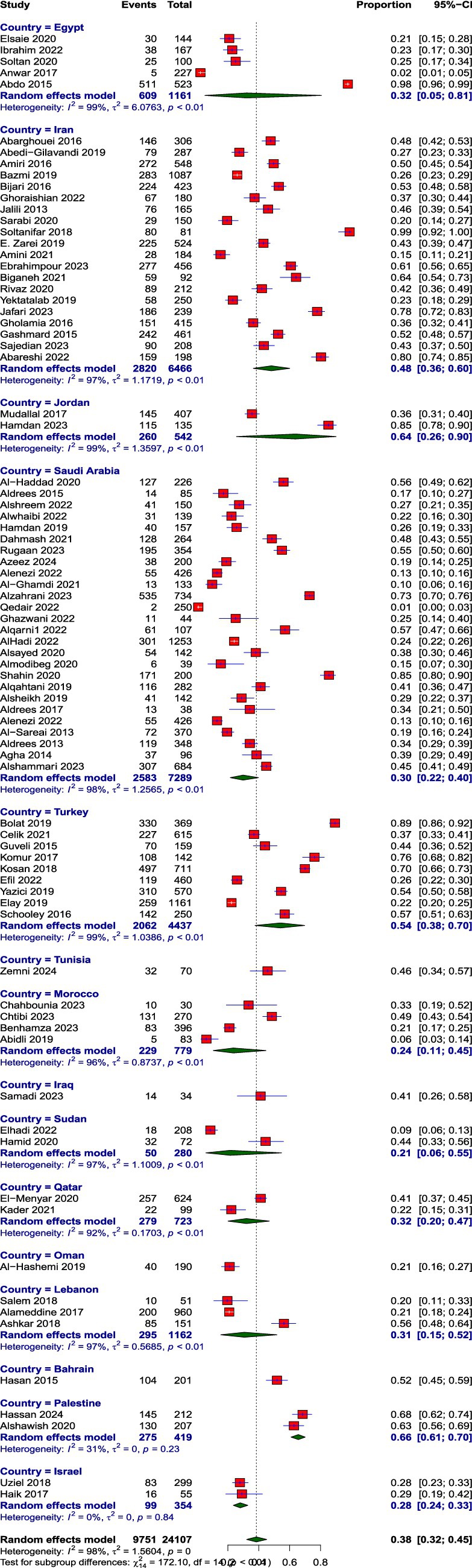 Forest plot showing the prevalence of studies across various Middle Eastern countries, including Egypt, Iran, Jordan, Saudi Arabia, Turkey, Tunisia, Morocco, Sudan, Qatar, Lebanon, Bahrain, Palestine, and Iraq. Each study is represented with a square and corresponding confidence interval lines. The plot includes a random effects model summary for each country and overall. Heterogeneity statistics are provided, with a vertical line representing no effect. The proportion estimates and confidence intervals are listed alongside.