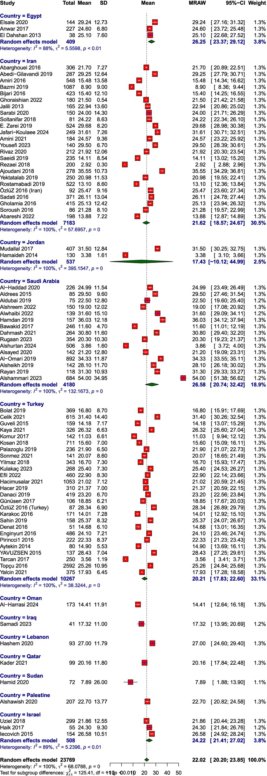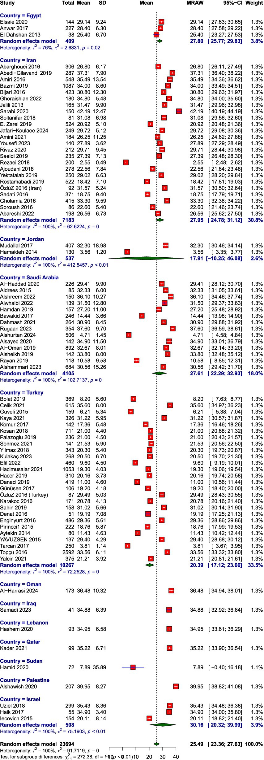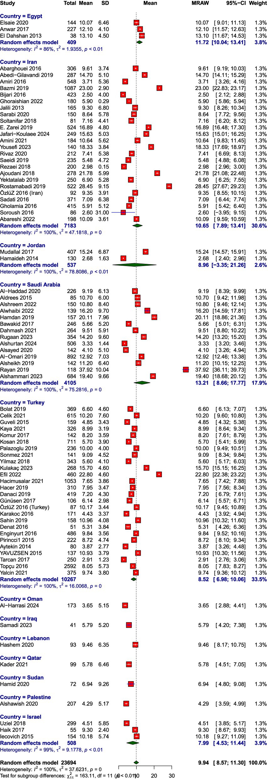 Forest plot depicting a meta-analysis of various studies from Middle Eastern countries, including Egypt, Iran, Jordan, Saudi Arabia, Turkey, and others. The plot shows study names, total participants, mean, standard deviation, mean weight, and confidence intervals. Each study is represented by a red square proportional to the study’s weight, with corresponding confidence intervals. Green diamonds represent overall effects for each country and the total random effects model, highlighting heterogeneity with results for each subgroup.