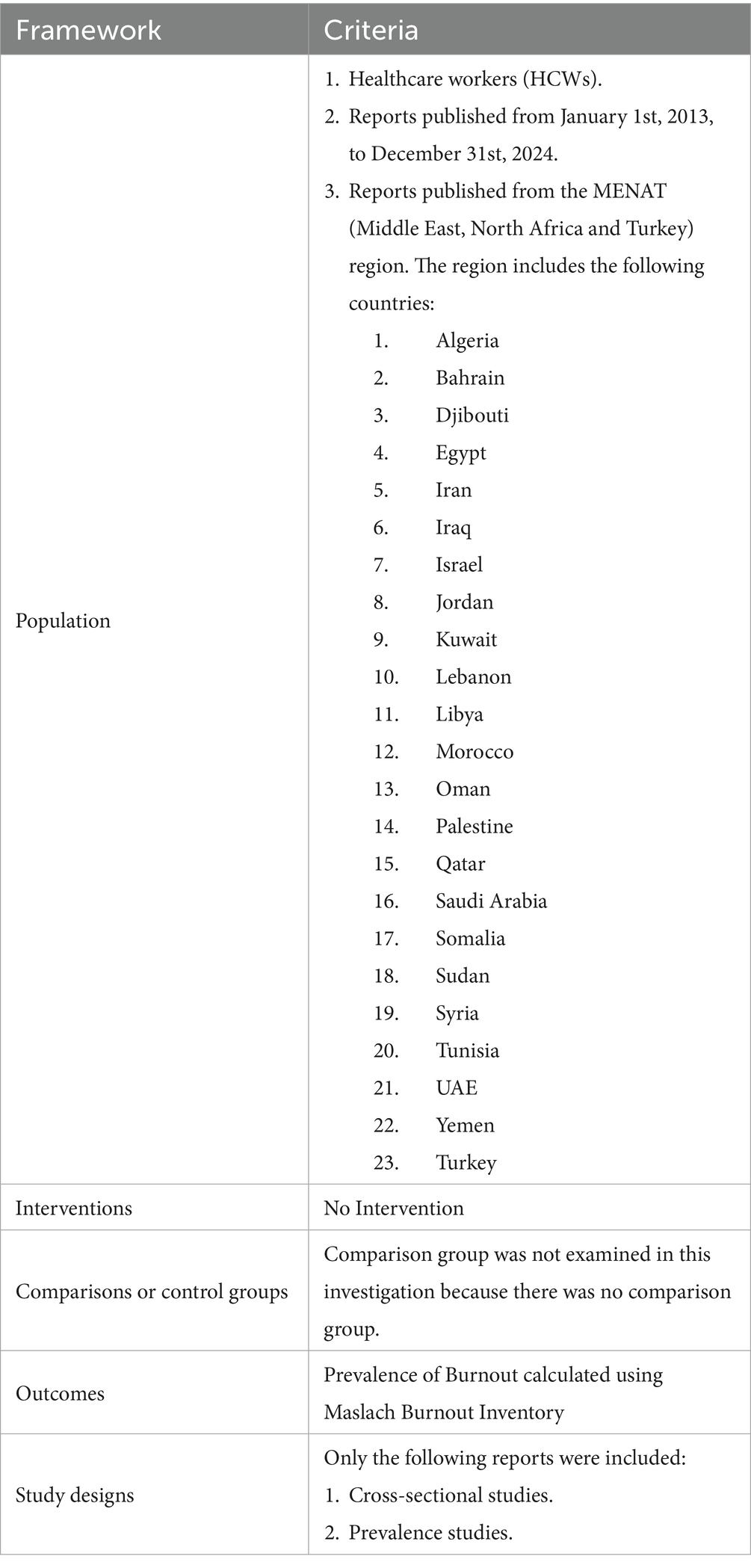 Table 1. Inclusion criteria for studies on burnout among healthcare workers in the MENAT region.