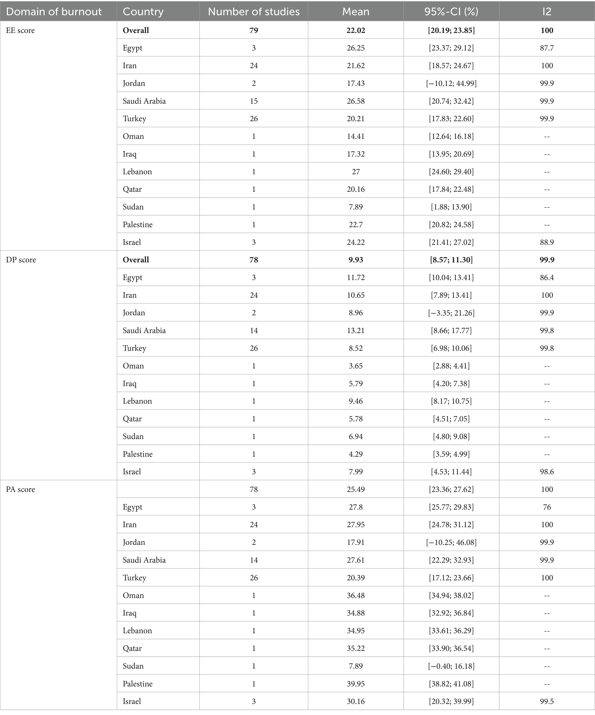 The pooled mean scores from the random-effects meta-analysis indicated moderate levels of burnout across the EE and DP and high PA subscales among healthcare workers in the MENAT region. The average score for EE was 22.02 (95% CI: 20.20–23.85), for DP was 9.93 (95% CI: 8.57–11.30), and for PA was 25.49 (95% CI: 23.36–27.63). Meta-analysis forest plots are presented in Figures 27. All three subscales, EE, DP, and PA, demonstrated substantial between-study heterogeneity, I2 = 100, 99.9, and 100, respectively. Our subgroup analysis of MENAT regions indicated a difference in MBI scores. For EE, Sudan (7.89) and Oman (14.41) demonstrated the lowest levels, indicating little burnout, followed by moderate levels in Iraq (17.32), Jordan (17.43), Qatar (20.16), Turkey (20.21), Iran (21.62), Palestine (22.70), and Israel (24.22). Higher EE rates were seen in Egypt (26.25), Saudi Arabia (26.58), and Lebanon (27.00). Regarding depersonalization (DP), the lowest scores were recorded in Oman (3.65), Palestine (4.29), Qatar (5.78), Iraq (5.79), and Sudan (6.94). Israel (7.99), Turkey (8.52), Jordan (8.96), Lebanon (9.46), and Iran (10.65) exhibited moderate DP levels, but elevated levels were observed in Egypt (11.72) and Saudi Arabia (13.21). Finally, the PA subscale, where lower scores represent increased burnout, showed Sudan (7.89), Jordan (17.91), and Turkey (20.39) with the lowest PA, suggesting greater burnout. Moderate PA ratings were reported in Egypt (27.61), Iran (27.95), and Israel (30.16). In contrast, higher PA scores were recorded in Iraq (34.88), Lebanon (34.95), Qatar (35.22), Oman (36.48), and Palestine (39.95), the last showing the highest sense of personal accomplishment among the countries analyzed (Table 2).