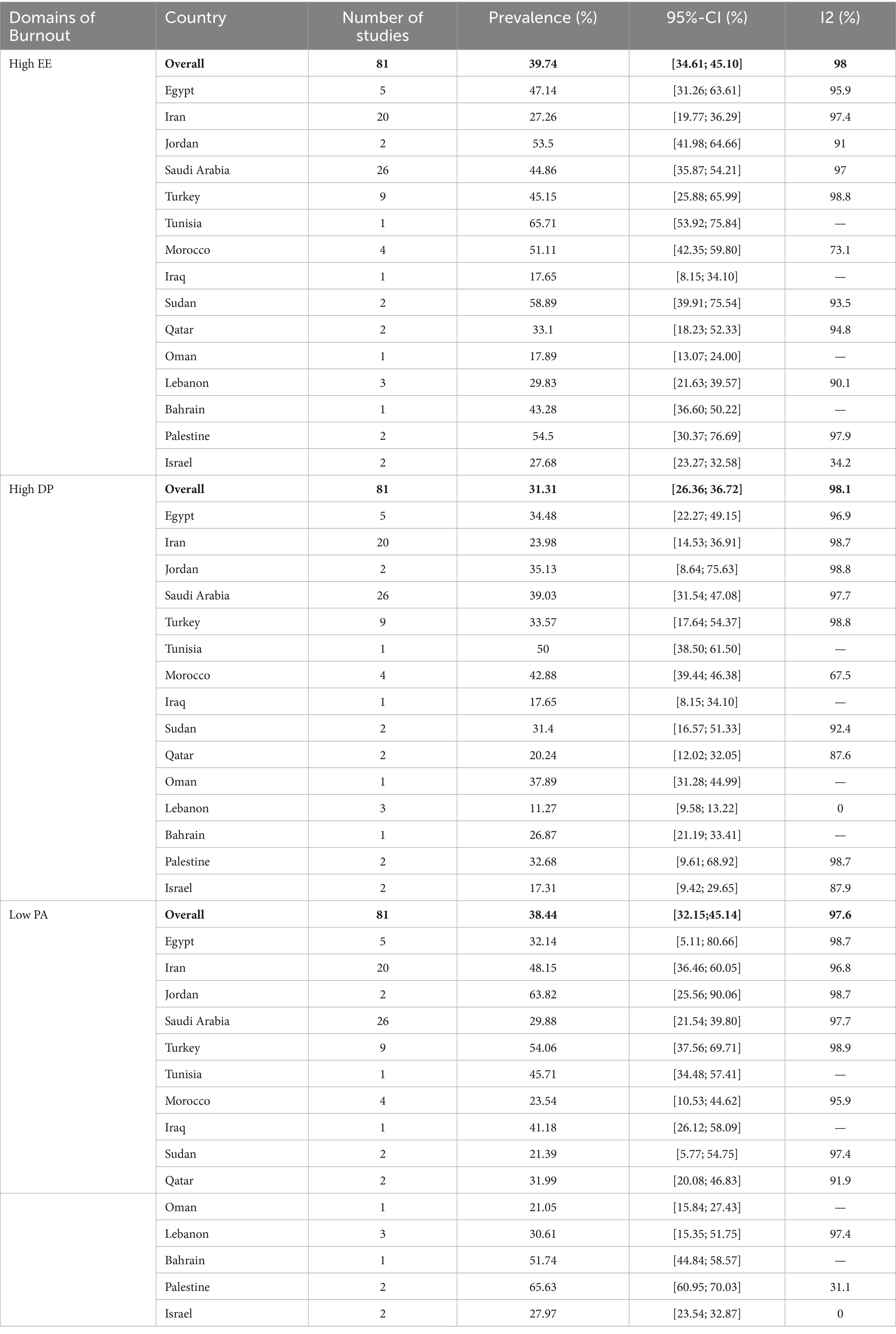 The prevalence of high EE varied remarkably across MENAT region countries. The rates vary through Iraq (17.65%), Oman (17.89%), Iran (27.26%), Israel (27.68%), Lebanon (29.83%), Qatar (33.1%), Bahrain (43.28%), Saudi Arabia (44.86%), Turkey (45.15%), Egypt (47.14%), Morocco (51.11%), Jordan (53.5%), Palestine (54.5%), Sudan (58.89%), and Tunisia (65.71%). The prevalence of DP also showed notable variation across MENAT countries. Lebanon reported the lowest prevalence at 11.27%, followed by Israel (17.31%) and Iraq (17.65%), Qatar (20.24%), Iran (23.98%), Bahrain (26.87%), Sudan (31.4%), Palestine (32.68%), Turkey (33.57%), Egypt (34.48%), Jordan (35.13%), Oman (37.89%), Saudi Arabia (39.03%), Morocco (42.88%), and Tunisia (50%), reflecting a considerable burden of detachment and cynicism in these populations. The prevalence of low PA varied widely across MENAT countries: Oman (21.05%), Sudan (21.39%), Morocco (23.54%), Israel (27.97%), Saudi Arabia (29.88%), Lebanon (30.61%), Qatar (31.99%), Egypt (32.14%), Iraq (41.18%), Tunisia (45.71%), Iran (48.15%), Bahrain (51.74%), Turkey (54.06%), Jordan (63.82%), and Palestine (65.63%) (Table 3).