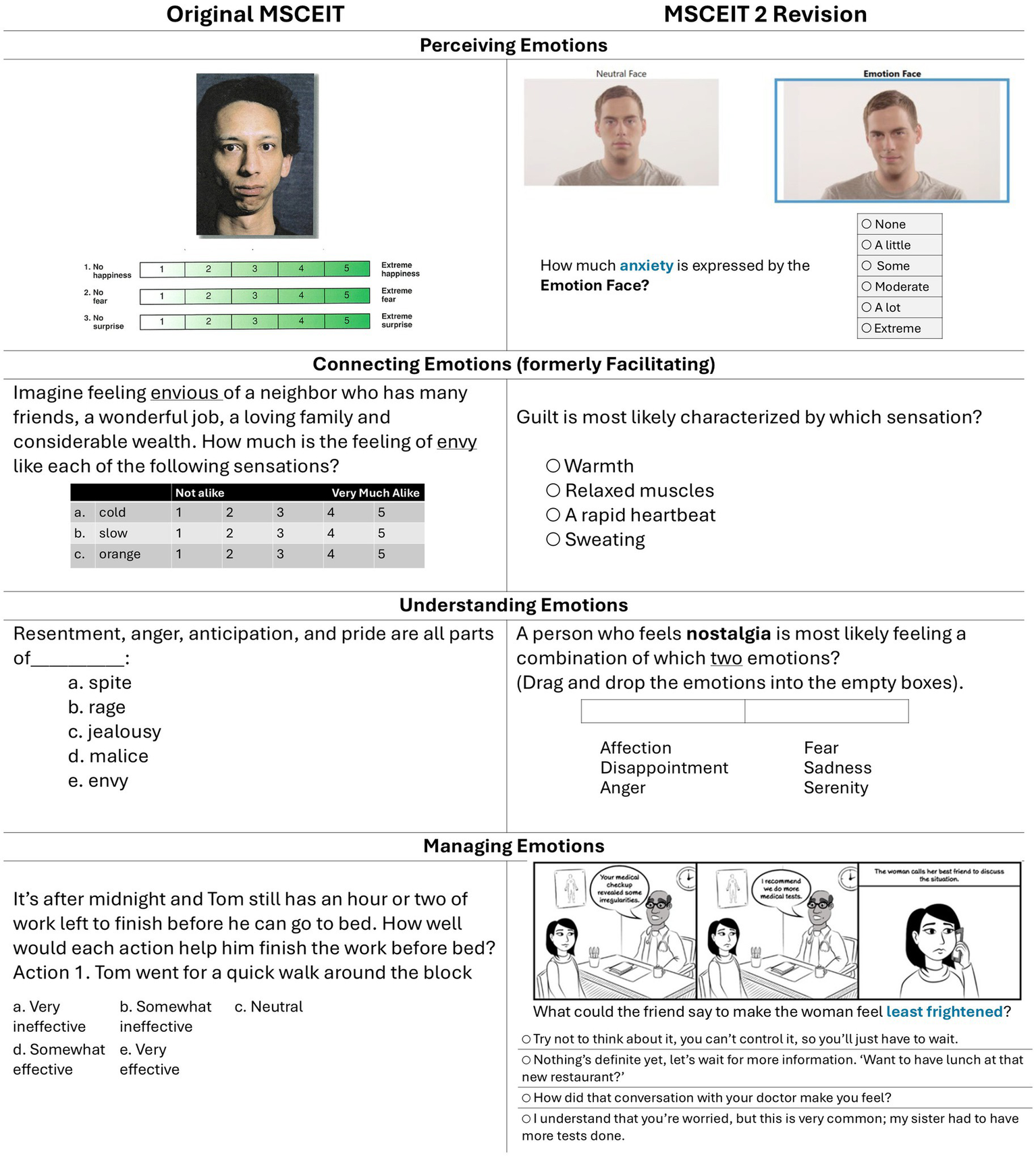 Representative items from early versions of the MSCEIT and MSCEIT 2, respectively. The MSCEIT 2 revision attempts to improve test-taker engagement and to employ uniform response scales. Some item formats have been adjusted in the figure for greater readability.