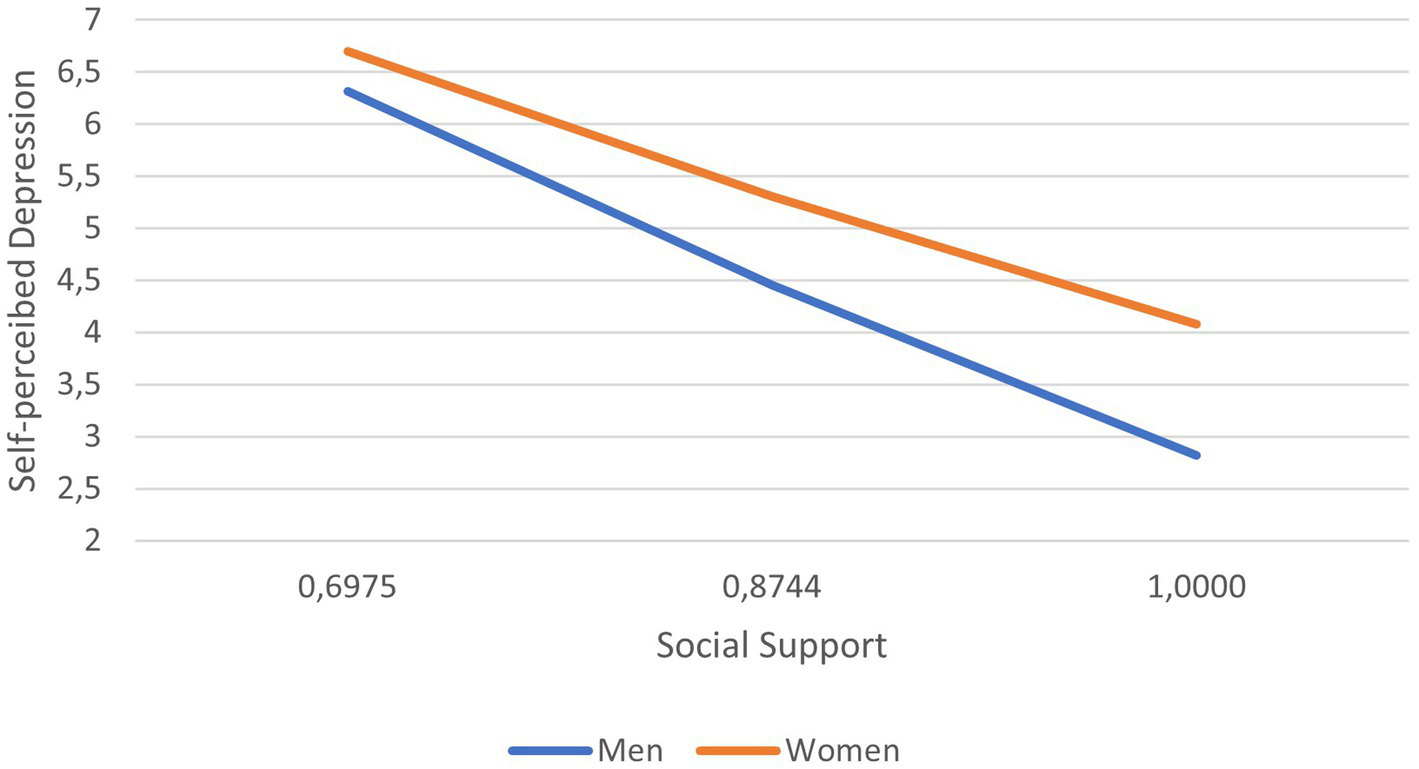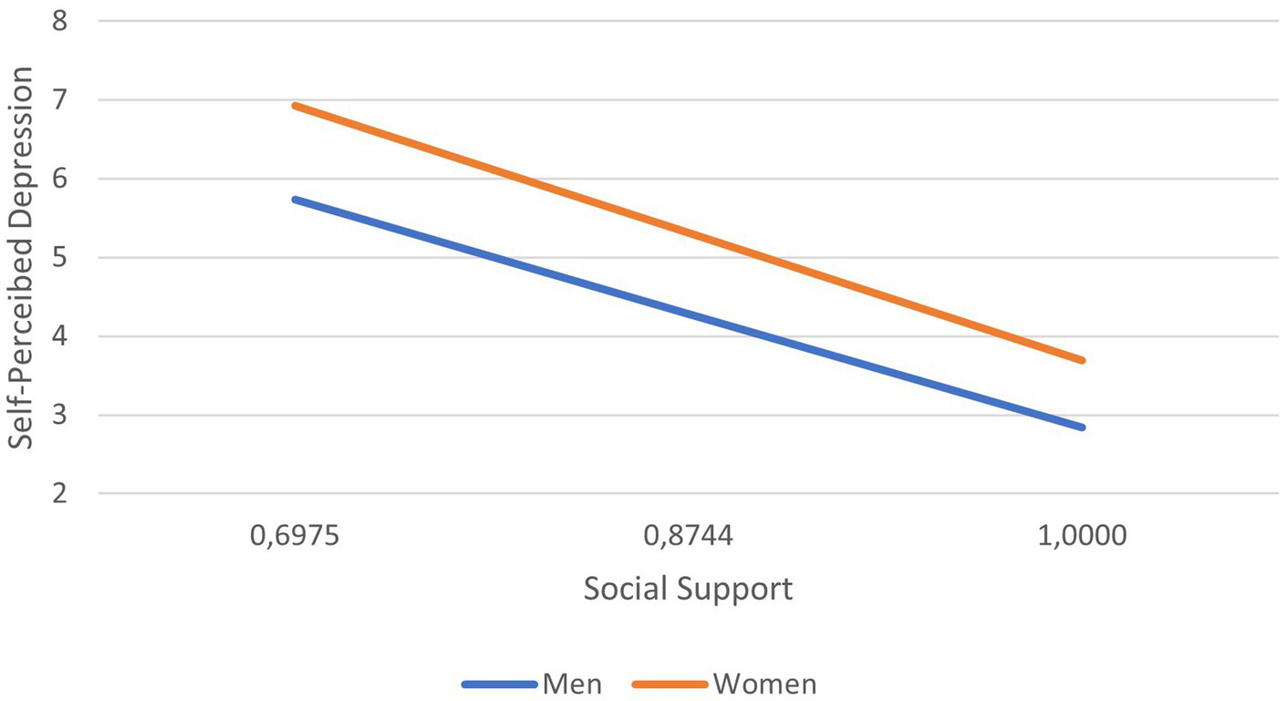 Thus, the objective of this research is to evaluate the sex moderating effect of perceived social support on the relationship between depression and self-perceived health, following a complex multiple-risk intervention carried out with patients in primary care (the EIRA cohort).