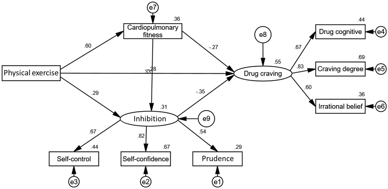 In this study, the researchers selected participants who had completed physical detoxification in China’s compulsory isolation drug rehabilitation centers. Moreover, we conducted surveys and assessed cardiorespiratory fitness using tools such as the Physical Exercise Rating Scale, Inhibition Scale, Drug Craving Scale, and Queen College Step Test. Additionally, we employed exploratory and confirmatory factor analyses, correlation analysis, regression analysis, and structural equation model (SEM) to analyze the study’s data.