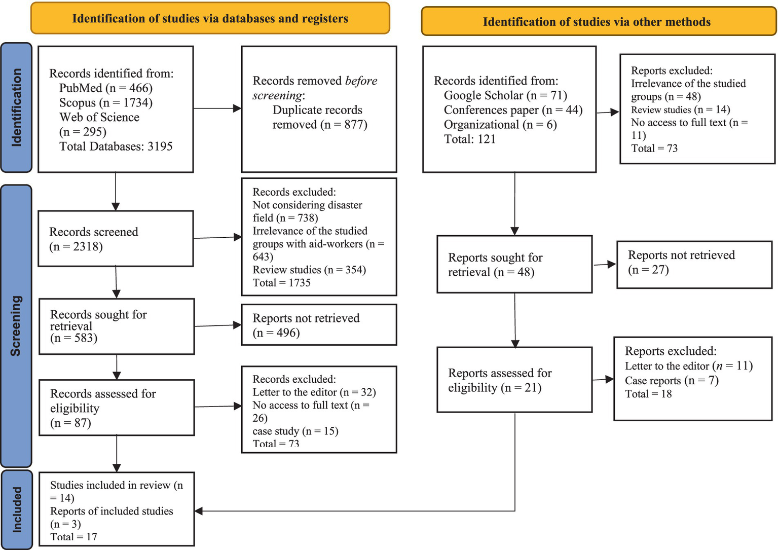 The initial search yielded 3,198 articles. After removing 877 duplicate records, the titles and abstracts of 2,318 articles were screened for relevance. Articles that did not focus on disaster settings or aid workers were excluded. A total of 1,735 articles were excluded during this stage. The full texts of 583 articles were sought for retrieval, of which 496 were unavailable. To mitigate potential bias from these omissions, related articles and cited references from included studies were examined. Ultimately, 87 articles were assessed for eligibility, and 17 studies met the inclusion criteria and were included in the final analysis (see Figure 1 for the PRISMA flow diagram).