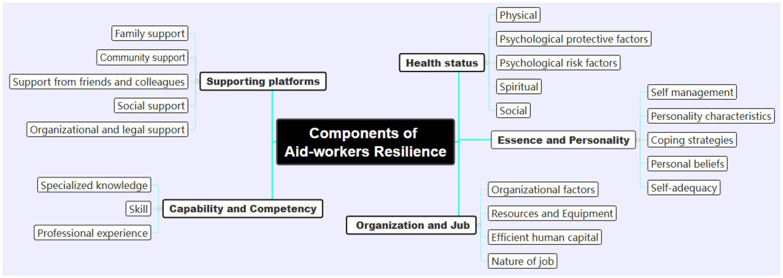 From 3,198 searched studies, 17 were included in the final analysis. We identified five key components of resilience among disaster and emergency aid workers, which were categorized into two main groups: traits and process. Resilience traits include (1) health status, (2) essence and personality, (3) capability and competency, and resilience process includes (1) support platforms, and (2) organization and job.