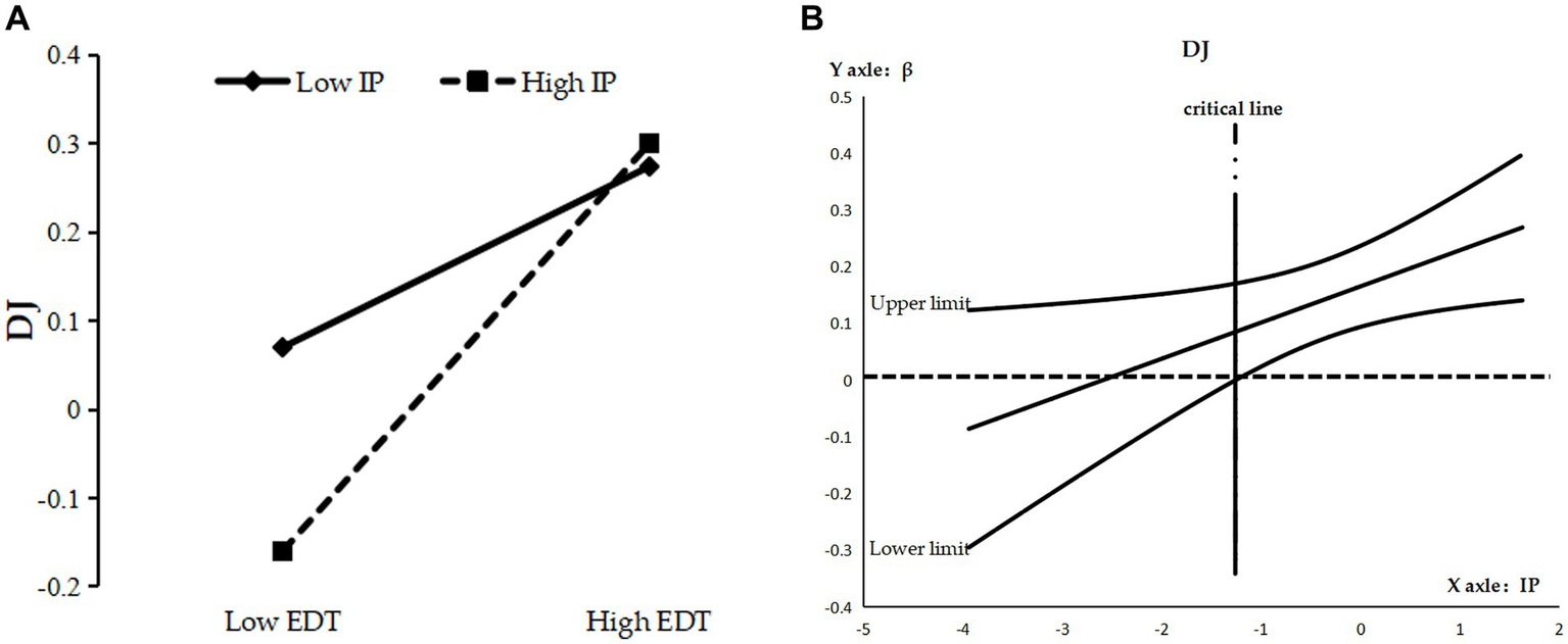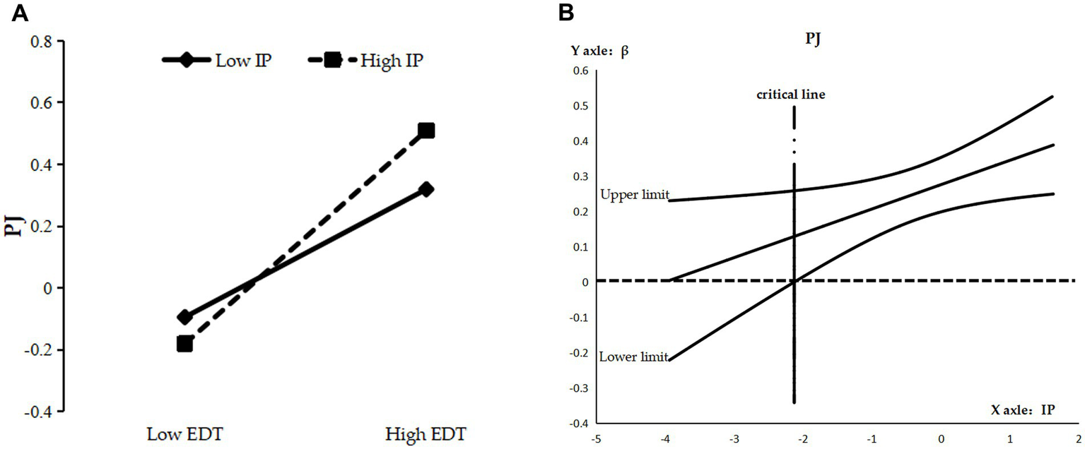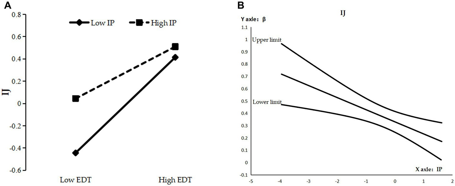 In contrast to the above moderating mechanisms, in terms of the interactional justice gain path, enterprise digital transformation has changed the traditional way in which information resources were mainly held and delivered by supervisors (Lepine et al., 2016), making employees more dependent on the enterprise digital platform for information. Employees with high information processing are more accustomed to actively searching and processing information (Morgeson and Humphrey, 2006), and have a greater ability to analyze information about the process and outcomes of compensation; therefore, they have a lower need for interactional justice from supervisors who provide information about social respect and decision-making (Ller et al., 2018). The perceived convergence of enterprise digital transformation with employees’ perception of interactional justice (obtained from supervisors) will be weakened by high information processing; consequently, the ability of enterprise digital transformation to indirectly enhance employees’ intrinsic motivation through the sense of interactional justice will be diminished. Accordingly, this study proposed the following hypothesis: