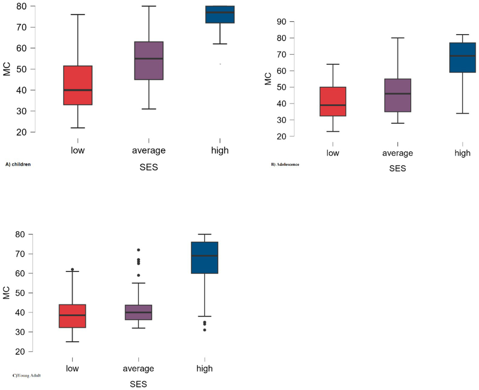 The results of the post-hoc test revealed that, except for the MC of the low and moderate SES groups in young adulthood (p = 0.207), and the MC of adolescents and young adults (p = 0.134), all other groups showed significant differences in MC (p < 0.05). These differences were observed between low and high SES, moderate and low SES, and moderate and high SES in children and adolescents, high and low SES, and high and moderate SES in young adulthood, children and adolescents, and children and adults.