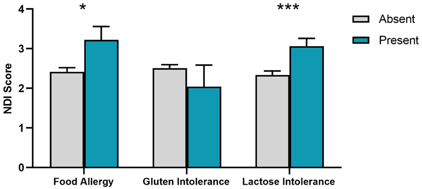 Food sensitivities were assessed with eight items. General food intolerance was assessed with a 4-choice item that asked “Do you have any food intolerances? (responses: No, Dairy/Lactose, Gluten, Other - please specify).” General Food Allergy was assessed with a binary item asking “Do you have any food allergies? (No, Yes—please specify).” These items were manually screened, and each participant classified as positive or negative for intolerances and allergies. Intolerances were classified as either: (1) positive for Lactose (but not Gluten) or (2) positive for Gluten (but not Lactose). Instances of positive for both Lactose and Gluten, negative for both, or positive for an Unspecified intolerance were very rare and excluded from analysis. Allergies were classified as positive for either Fruit, Shellfish/Fin-fish, Peanut/Tree-nut or Other, with responses summed to create a Food Allergy score that ranged from 0 to 4.