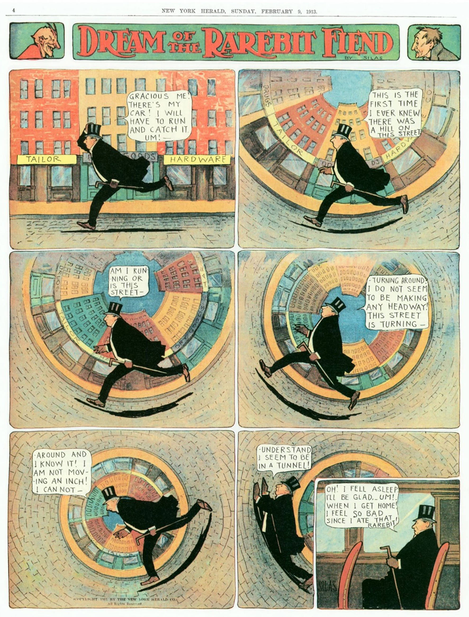 Protagonists in the cartoons of Winsor McCay frequently blamed their presleep ingestion of cheese dishes for occurrences of bizarre dream and nightmare events. (Reproduced from “Dream of the Rarebit Fiend” by Windsor McCay, Dream of the Rarebit Fiend by Winsor McCay : Winsor McCay : Free Download, Borrow, and Streaming : Internet Archive, CC0).