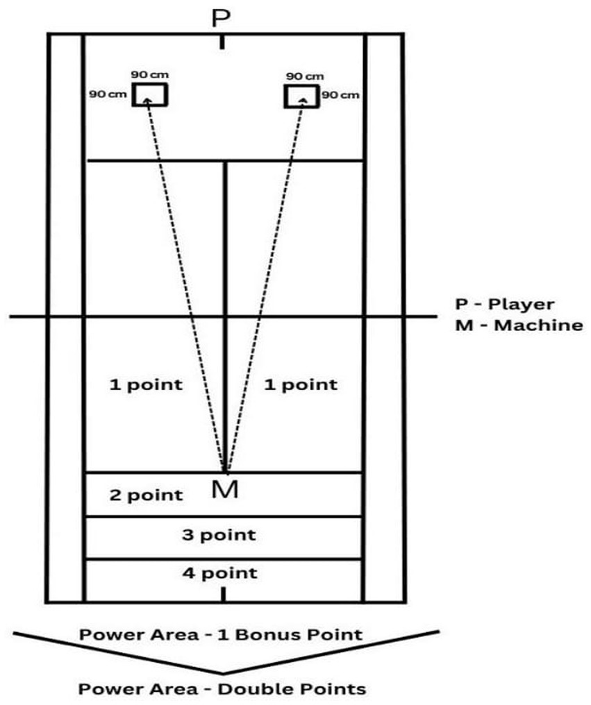 The participant receives 0 points if the ball gets stuck in the net or falls outside the playing field. In case of falling inside, the participant gets 1, 2 or 3 points depending on the area where he fell first, 0 points if he falls inside the playing field depending on the area, he fell 2nd, and 1 extra point if he falls in the area written as force field - 1 extra point. If the ball lands in the force area - Double points written area, the score from the first area will be multiplied by 2. 1 extra point is awarded for each ball that falls in. The participant can collect a maximum of 84 points from this section (Figure 3).