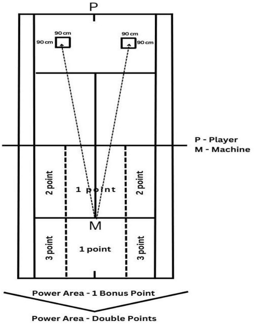 As seen in Figure 1, the player makes 5 forehand and 5 backhand hits alternately on the balls thrown to 90×90 cm drawn targets from the ground ball throwing machine shown as P on the tennis court. The participant receives 0 points if the ball falls out or gets stuck in the net. In case the ball falls inside.