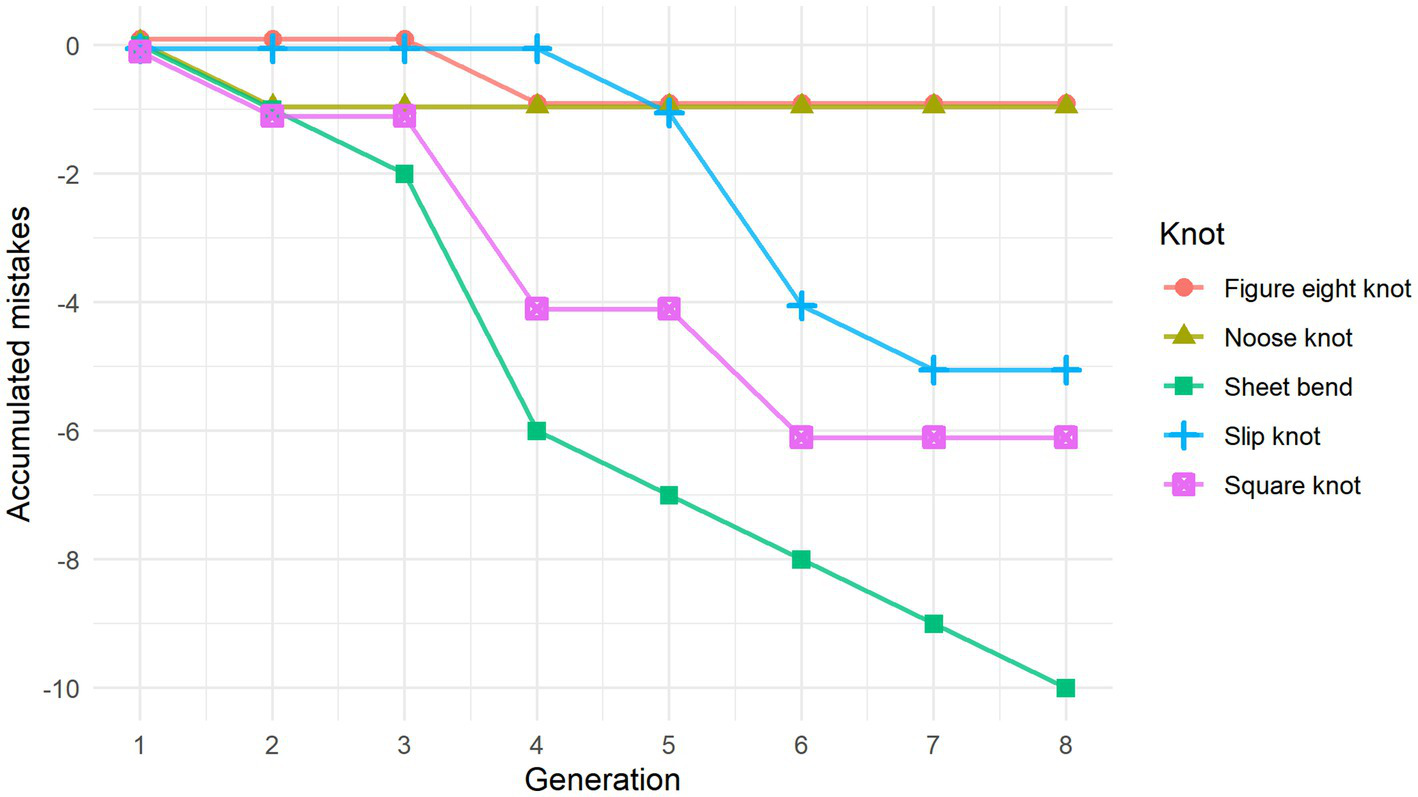 Line graph showing the accumulation of errors made to the individual knots in relation to the original stimuli. Curve-steepness reflects the knot’s similarity to that of the previous generation, with a horizontal line indicating a perfect replication of the knot stimuli they were shown.