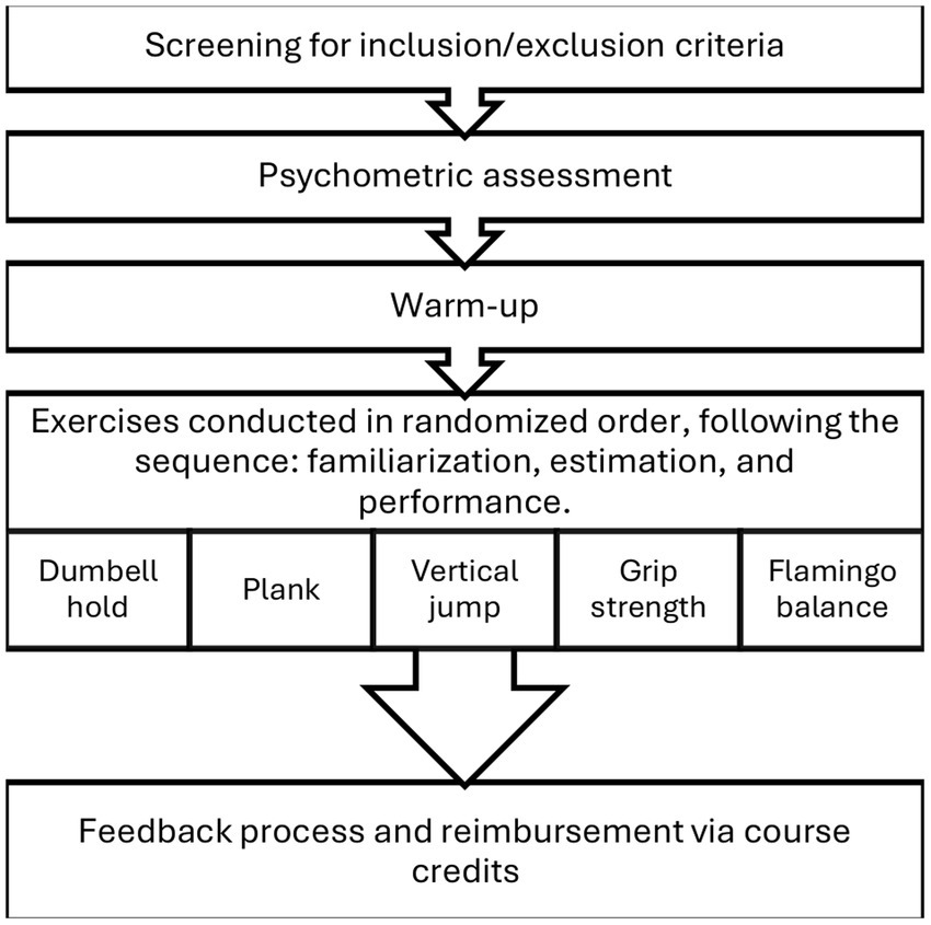Before each exercise, participants were allowed a brief 3–5 s familiarization period and were instructed on proper technique until satisfactory and safe execution was achieved. They were asked to estimate their future performance in the given task, if they utilized maximum effort. This brief familiarization period was chosen to ensure task comprehension while minimizing potential learning effects that could influence performance predictions. Longer familiarization might have led to unintended adaptation, where participants refine their estimates based on real-time adjustments rather than relying on pre-existing self-assessment abilities.