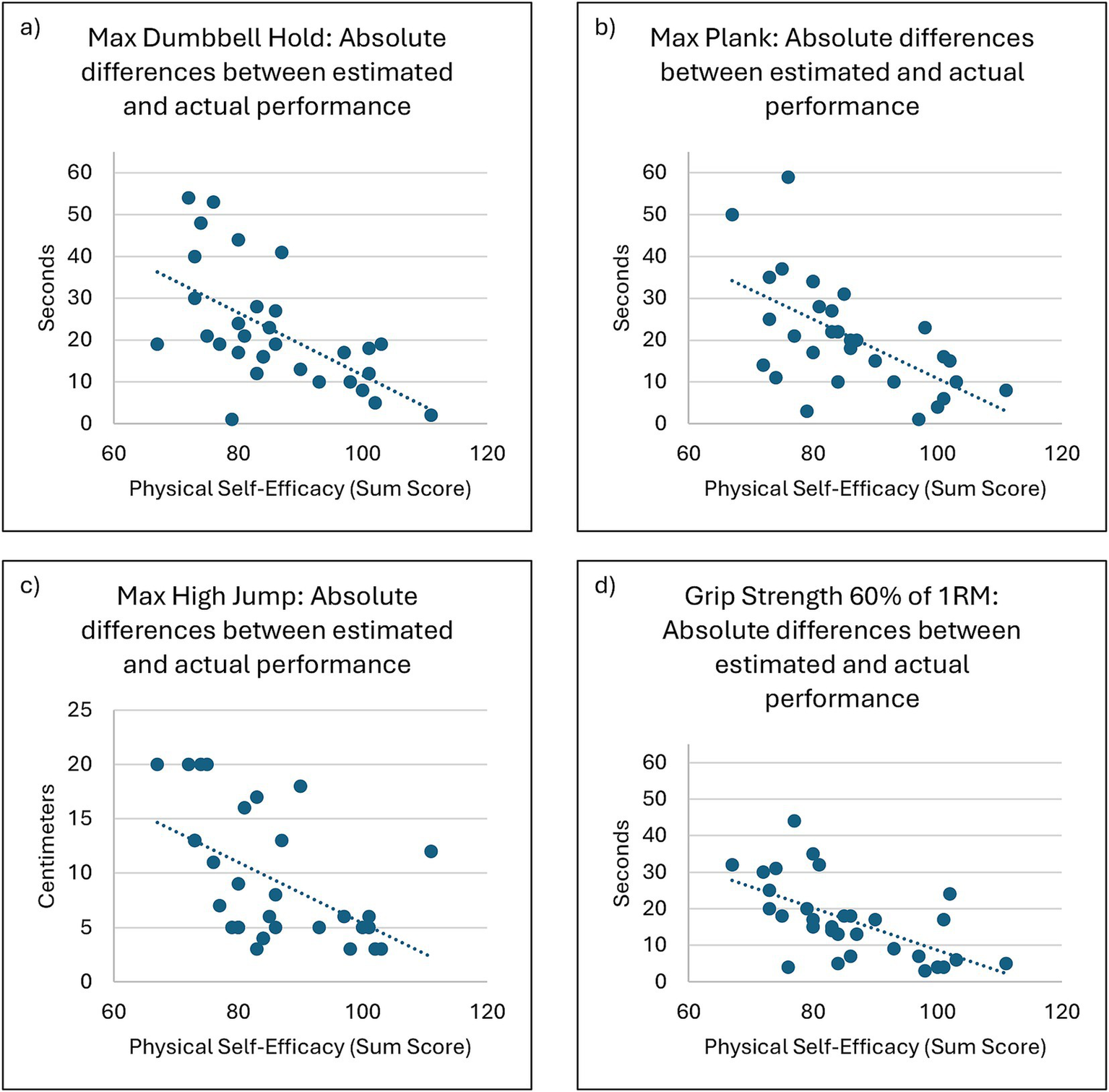 Scatterplots of linear regression models showing the relationship between physical self-efficacy (PSE) and performance estimation accuracy across all exercises. Each panel corresponds to one exercise: dumbbell hold (a), plank hold (b), standing high jump (c), and grip strength (d). Higher PSE was significantly associated with greater estimation accuracy in all exercises (p < 0.01), indicating that individuals with higher self-efficacy exhibited a smaller discrepancy between estimated and actual performance. Regression statistics, including effect sizes and confidence intervals, are detailed in Table 1.