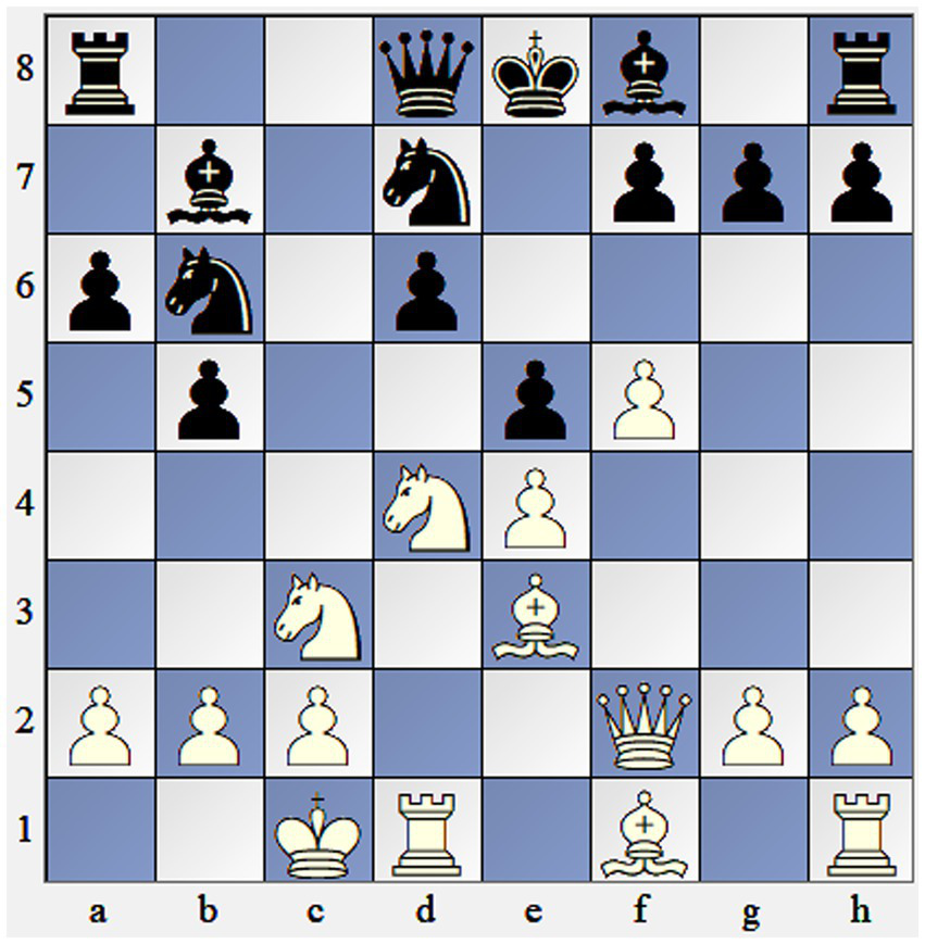 Participants were asked to choose the best move in three chess positions of different levels of difficulty (Figures 1–3). The overall time limit for each chess position was 5 min. Responses of the participants were then independently rated by three chess experts across 6 dimensions: violation of heuristics, economical win, sacrifice of material, employing chess themes, correctness, and originality (Table 1). Raters assigned values from 1 to 5 across six dimensions to all solutions and reached a high level of inter-rater reliability with α = 0.936.
