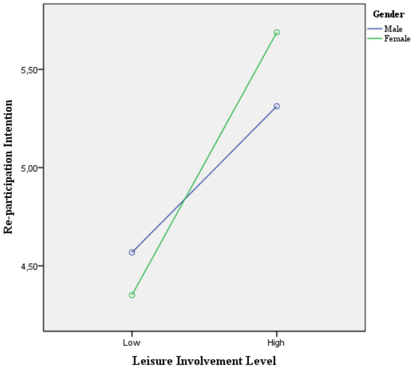 Average scores for re-participation intention of male and female with different levels of involvement.