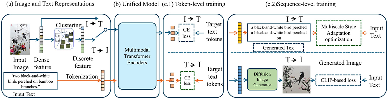 Figure 1. The proposed ArtCLIP freehand painting creation framework. (a) Image and Text Representations: Input images and text are processed into dense and discrete features. Images undergo clustering to obtain discrete features, while text is tokenized. (b) Unified model: a multimodal transformer encoder is trained for two tasks: image-to-text (I → T) and text-to-image (T → I), optimized using cross-entropy loss. (c) Sequence-level training: higher-level training includes generating images from text and generating text from images, using multiscale style adaptation optimization and CLIP-based loss, respectively.