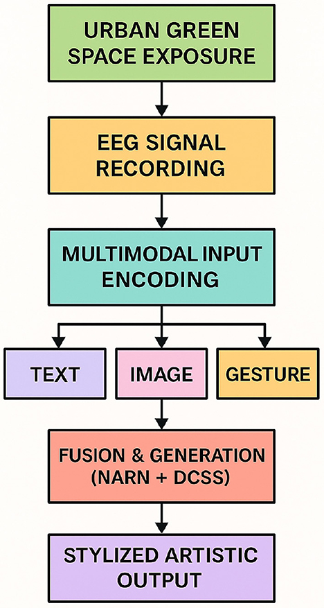 To improve the accessibility of our framework for interdisciplinary readers, particularly those from psychology and neuroscience backgrounds, this study introduces a conceptual overview figure (see Figure 2) that illustrates the full pipeline of ArtCLIP. This figure abstracts away technical details and highlights the core flow: from environmental exposure to urban green spaces, through EEG signal recording, to multimodal encoding (textual, visual, and gestural inputs), fusion and generation via our NARN and DCSS models, and ultimately stylized artistic output. This high-level visual summary is intended to provide conceptual clarity on how different modalities contribute to the system, aligning with the broader goal of bridging computational modeling and affective experience in natural environments.