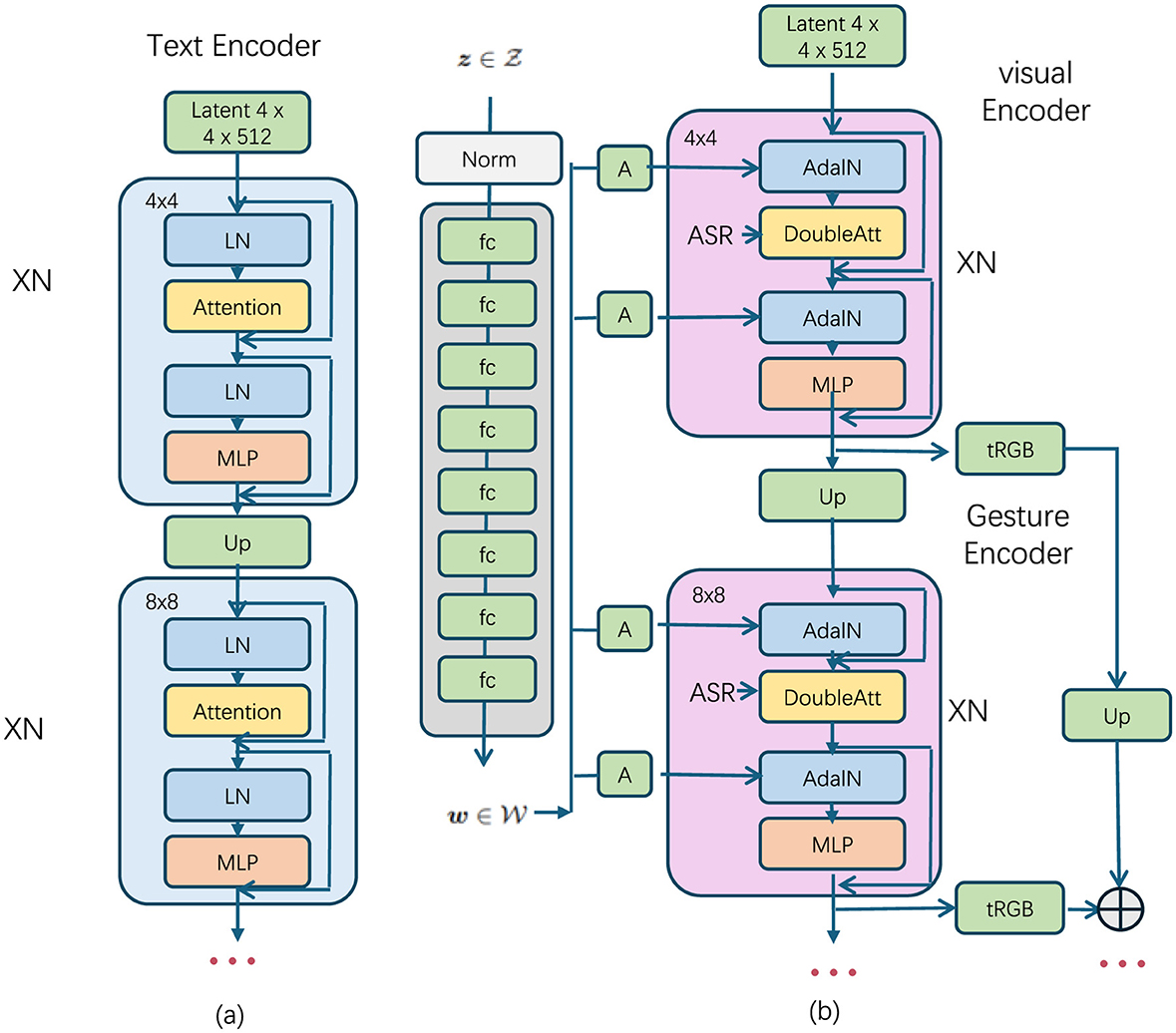 Figure 3. The structure of the multimodal transformer encoders. (a) Text encoder: processes the input text using layers of normalization (LN), attention mechanisms (Attention), and multilayer perceptrons (MLP), with progressive upsampling to increase resolution. (b) Visual encoder and gesture encoder: the visual encoder processes visual data using adaptive instance normalization (AdaIN) and double attention mechanisms (DoubleAtt); the gesture encoder handles gesture information, generating RGB output, which is combined through weighted fusion for the final output.