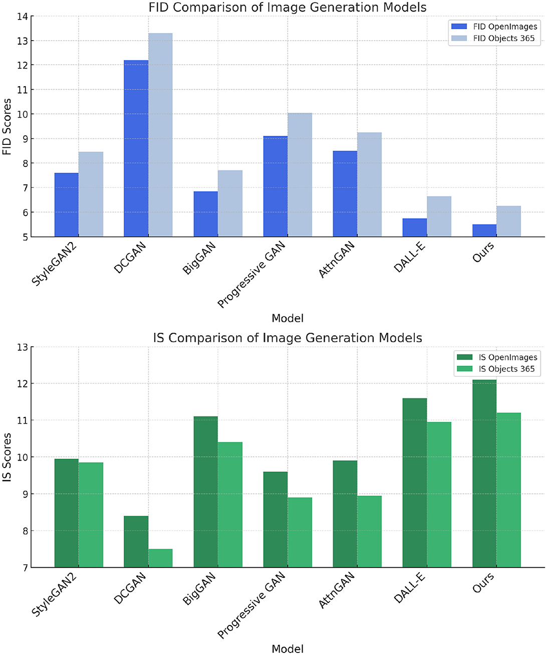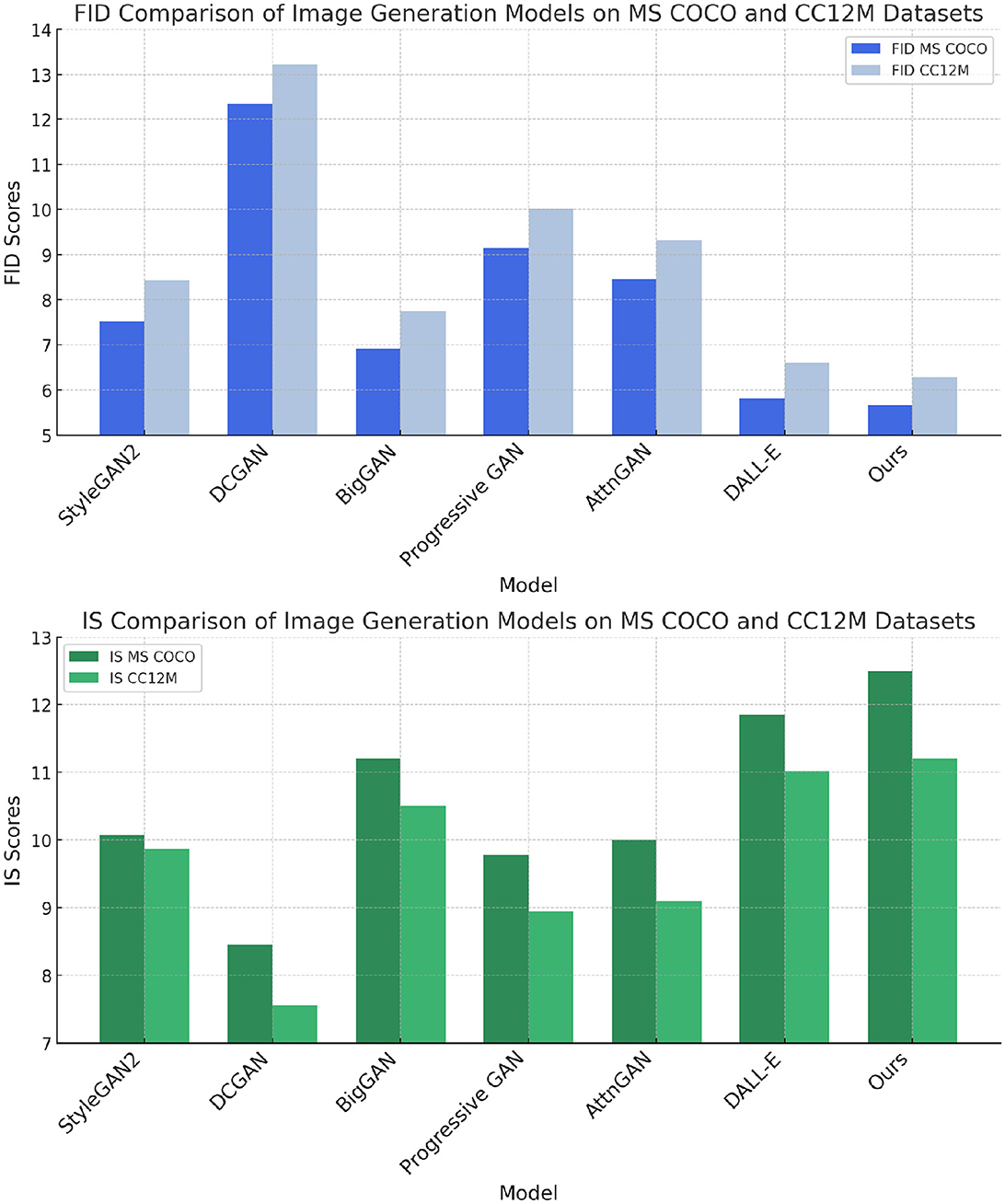 In Figure 5, the results on OpenImages and Objects365 datasets are shown. Our model achieves the best performance across all metrics on both datasets, with FID scores of 5.50 and 6.25, respectively, outperforming the well-known models such as StyleGAN2, BigGAN, and DALL-E. Our model improves upon the FID score of BigGAN by 1.35 on OpenImages and by 1.45 on Objects365. This indicates that our model generates images that are not only closer to the real image distribution but also exhibit higher visual quality. Furthermore, our model's IS scores of 12.10 on OpenImages and 11.20 on Objects365 surpass all other models, demonstrating superior diversity in the generated samples. The precision and recall values further corroborate the results, with our model achieving the highest precision (0.91 on OpenImages and 0.89 on Objects365) and recall (0.85 on OpenImages and 0.82 on Objects365), reflecting its ability to generate a wide variety of high-quality images. Similarly, Figure 6 displays the results on the MS COCO and CC12M datasets. Once again, our model outperforms the existing methods, achieving the lowest FID score of 5.67 on MS COCO and 6.28 on CC12M. Compared to DALL-E, which is one of the leading models in image generation, our model achieves a 0.13 improvement in FID on MS COCO and a 0.32 improvement on CC12M. These results demonstrate the generalization capability of our model across different datasets, regardless of the image complexity or dataset size. In terms of IS, our model achieves scores of 12.50 on MS COCO and 11.20 on CC12M, highlighting its ability to generate diverse and high-fidelity images. The precision and recall values further emphasize our model's advantages. It achieves the highest precision (0.92 on MS COCO and 0.90 on CC12M) and recall (0.85 on both datasets), indicating that our model excels in generating a variety of images while maintaining high accuracy in recreating real-world visual features. The superior performance of our model can be attributed to several key innovations in its architecture. First, the improved attention mechanism allows the model to focus more effectively on relevant areas of the input data, which enhances the quality and consistency of the generated images. This is particularly evident when comparing the results on datasets like OpenImages and MS COCO, which contain complex scenes with multiple objects. Second, the model benefits from a more advanced adversarial training approach, which enables better alignment between the generated image distribution and the real data distribution. This is reflected in the consistent improvements in FID and IS across all datasets. The model's architecture is designed to handle a wide range of image complexities, which is why it performs so well on both object-rich datasets like Objects365 and large-scale datasets like CC12M.