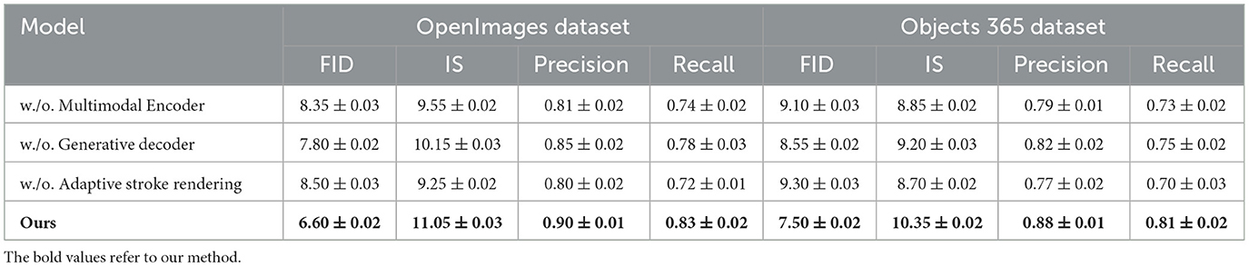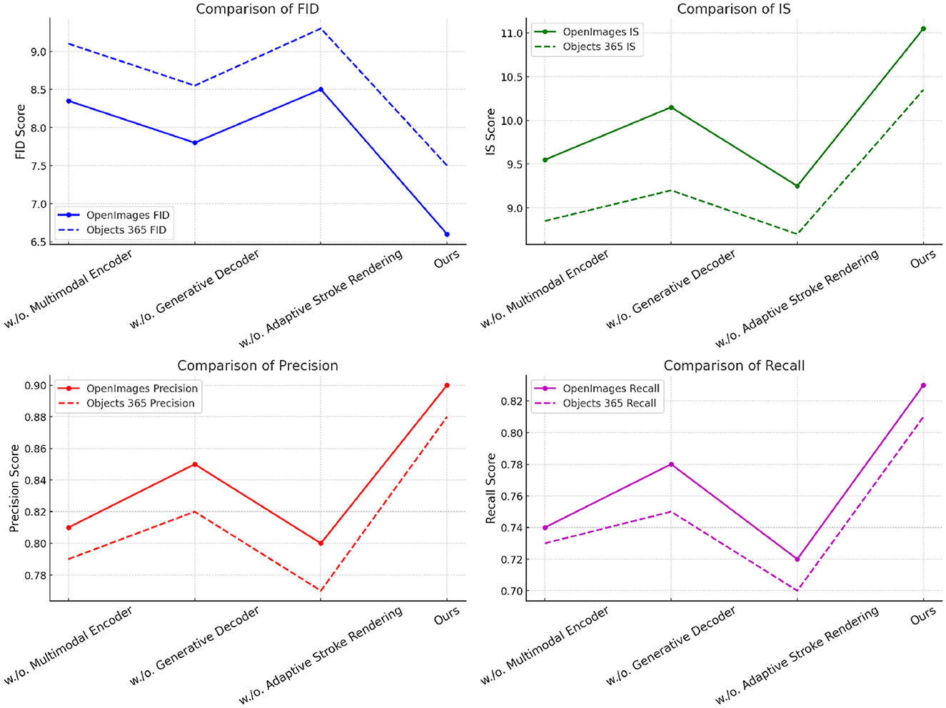The ablation study is conducted to evaluate the contribution of different modules in our proposed model, providing insights into how each component affects overall performance. This study analyzes the results across two benchmark datasets: OpenImages (Zhou et al., 2022) and Objects365 (Meng et al., 2023), as shown in Table 3 and Figure 7. The metrics considered include Fréchet Inception Distance (FID), Inception Score (IS), Precision, and Recall, which are critical in assessing the quality and diversity of the generated images. As indicated in the results, whenMultimodal Encoder is removed, the performance deteriorates, with an FID score of 8.35 on OpenImages and 9.10 on Objects365. This signifies thatMultimodal Encoder plays a crucial role in maintaining image quality and diversity. Interestingly, removingGenerative Decoder yields a lower FID score of 7.80 on OpenImages, which indicates that its contribution primarily enhances the Inception Score, rising to 10.15. Meanwhile, Adaptive Stroke Rendering's removal results in an FID of 8.50 on OpenImages and 9.30 on Objects365, suggesting that while it impacts performance, the effect is less pronounced than that of Modules A and B. In contrast, our full model configuration achieves the lowest FID scores of 6.60 on OpenImages and 7.50 on Objects365, along with the highest IS values of 11.05 and 10.35, respectively. The precision and recall metrics also indicate that our model maintains a superior performance with values of 0.90 and 0.83 on OpenImages, and 0.88 and 0.81 on Objects365.