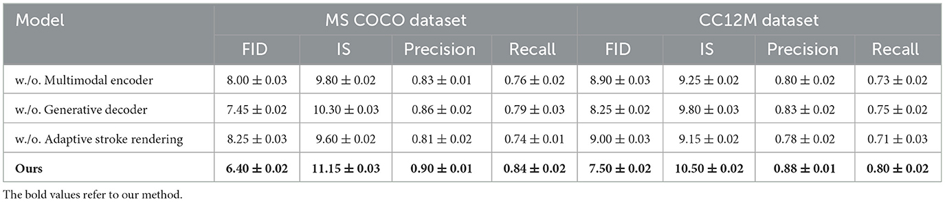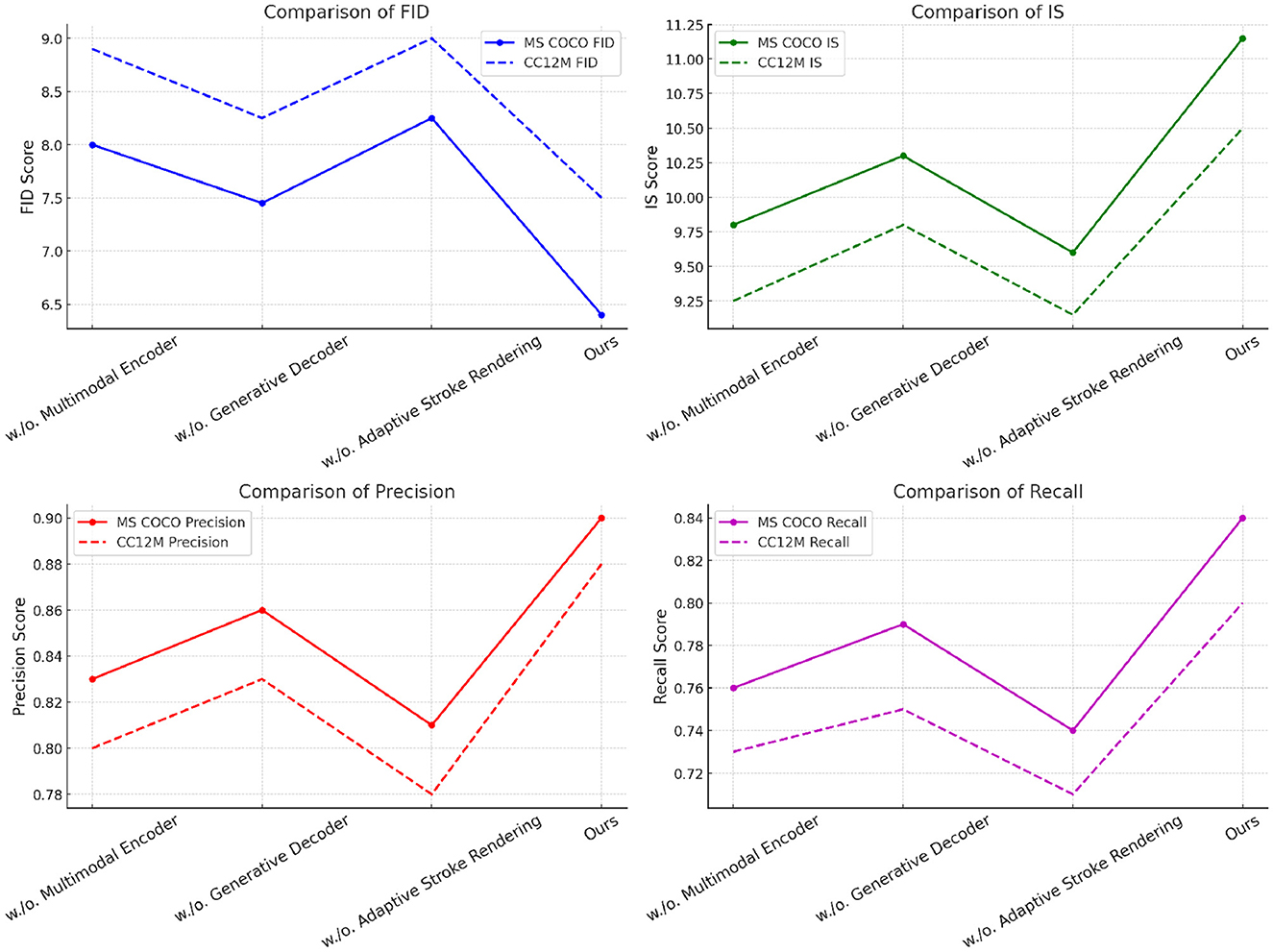 These results collectively illustrate the necessity of each module in achieving optimal performance. Further analysis is performed on the MS COCO (Ma et al., 2022) and CC12M (Changpinyo et al., 2021) datasets, as detailed in Table 4 and Figure 8. The absence ofMultimodal Encoder leads to an FID score of 8.00 on MS COCO and 8.90 on CC12M, confirming its importance for image fidelity. Meanwhile, omitting Generative Decoder results in an improved IS of 10.30, emphasizing its role in enhancing diversity. The exclusion of Adaptive Stroke Rendering impacts recall significantly, resulting in values of 0.74 on MS COCO and 0.71 on CC12M. Our complete model continues to show robust performance with FID scores of 6.40 on MS COCO and 7.50 on CC12M, demonstrating its capacity to generate high-quality images across varying conditions. The precision and recall metrics consistently remain high at 0.90 and 0.84 for MS COCO and 0.88 and 0.80 for CC12M, reinforcing the model's effectiveness in generating diverse and high-fidelity images.