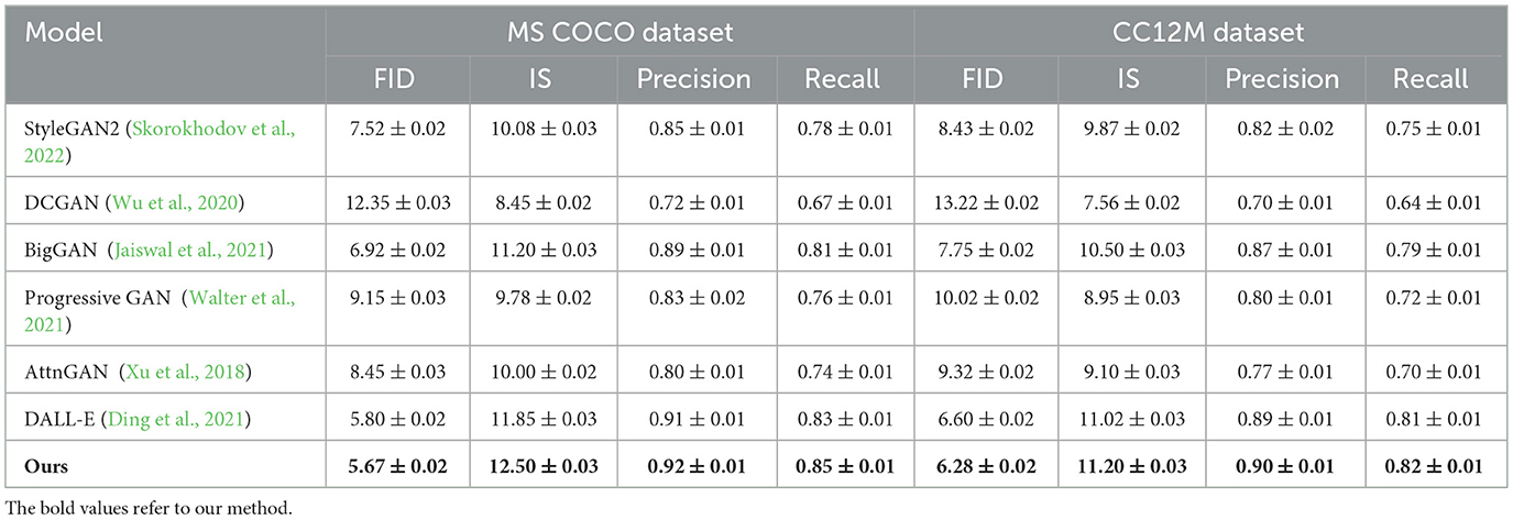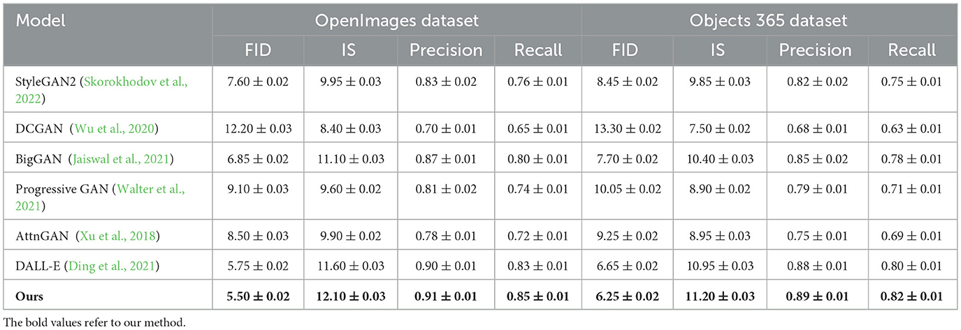 In this section, this study compares the performance of our proposed model with several state-of-the-art (SOTA) models across multiple benchmark datasets, including OpenImages (Zhou et al., 2022), Objects365 (Meng et al., 2023), MS COCO (Ma et al., 2022), and CC12M (Changpinyo et al., 2021). The evaluation metrics include Fréchet Inception Distance (FID), Inception Score (IS), Precision, and Recall. These metrics provide a comprehensive assessment of the generative capabilities of the models, considering both the quality and diversity of the generated images. Tables 1, 2 present the quantitative results of the comparison.