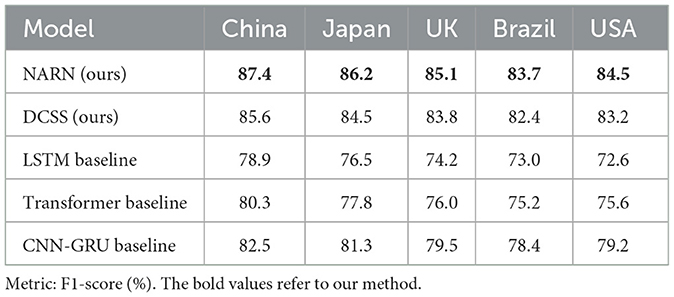 As shown in Table 5, the proposed NARN and DCSS models consistently outperformed all baselines across all five cultural contexts. NARN achieved the highest F1-scores in every region, with particularly strong performance in East Asian countries (China: 87.4%, Japan: 86.2%). Notably, even in culturally distinct datasets such as Brazil and the USA, NARN maintained robust performance (83.7% and 84.5%, respectively), suggesting that the model effectively captures core neurophysiological patterns of stress perception that generalize across diverse aesthetic interpretations of green space. Compared to deep learning baselines, the CNN-GRU model came closest in performance but still lagged by 3–5 percentage points on average. LSTM and Transformer-based models showed larger drops in performance, particularly in Western contexts, possibly due to overfitting or limited interpretability of EEG features without customized attention mechanisms. These results substantiate the generalizability of the NARN and DCSS frameworks, demonstrating their applicability beyond the originally tested dataset and reinforcing their suitability for cross-cultural applications in urban neuroscience and affective computing.