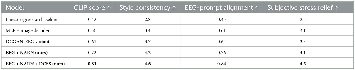 Table 6. Comparative performance of different EEG-to-Art modeling approaches under green space exposure.
