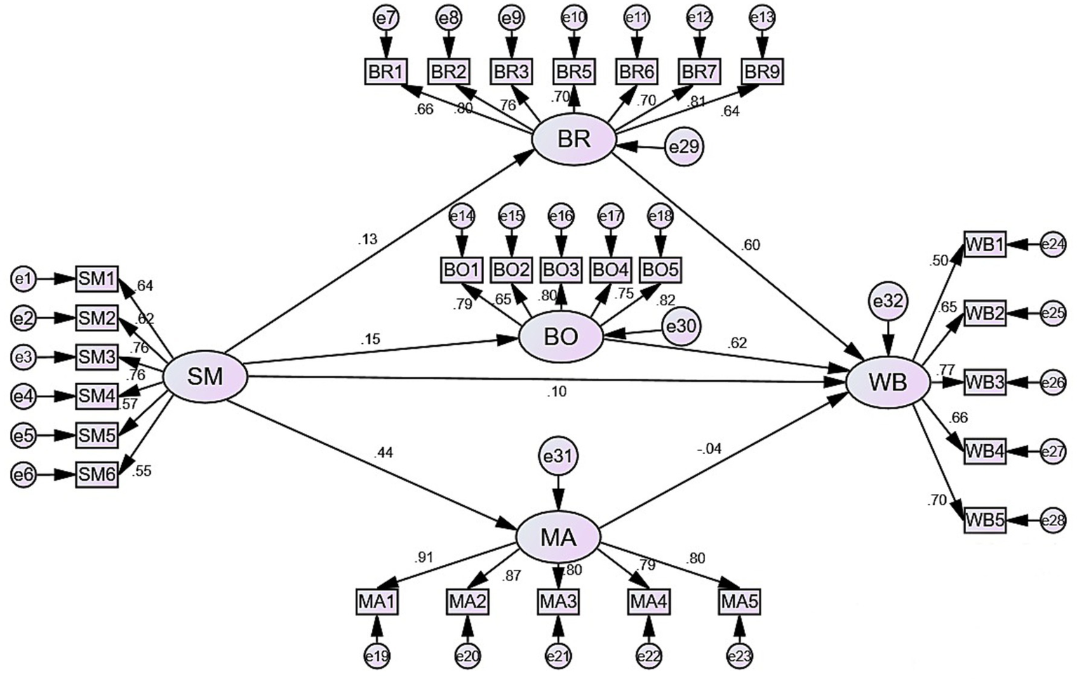 Figure 2 presents the results of the structural equation modeling. The CMIN/DF ratio is 3.889, falling within the range of 3–5. The RMSEA value is 0.078, within the acceptable range of less than 0.08. Additionally, the test results for GFI, IFI, and CFI all meet the adequate level of above 0.8 (Fornell and Larcker, 1981). Therefore, the measurement model for the relationship between social media use and subjective well-being exhibits a good fit.
