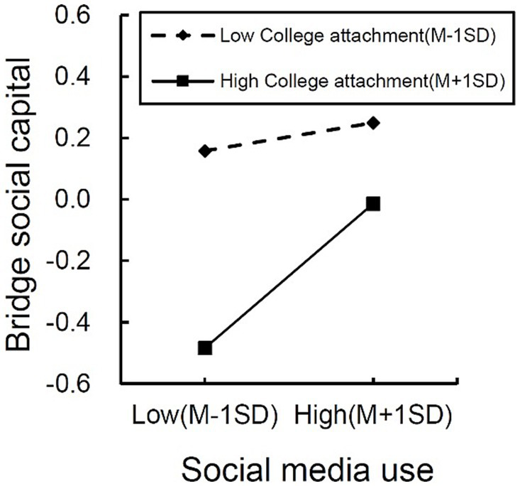 To better explain the moderating effect of college attachment, we used a simple slope to examine Figure 3, which illustrates the relationship between social media use and subjective well-being among two college attachment groups. Simple slope tests showed that for international students with low college attachment, social media use did not significantly predict bridging social capital (βsimple = 0.038, p > 0.05). However, for international students with high college attachment, social media use significantly predicted bridging social capital (βsimple = 0.198, p < 0.001). In the high college attachment group (M + 1SD), individuals’ subjective well-being increases as the degree of social media use increases, indicating that college attachment plays a positive moderating role. In other words, when international students have a higher level of college attachment, their use of social media will significantly impact their subjective well-being.