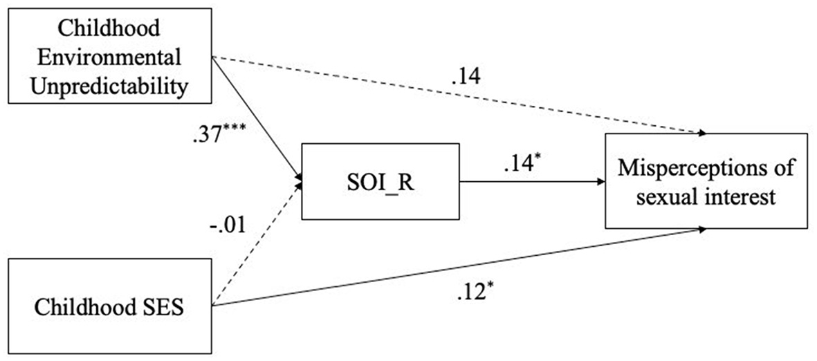 Study 2 aimed to investigate how two dimensions of ELA, childhood SES (as a proxy for deprivation-based adversity) and environmental unpredictability, affect men's sociosexual orientation and their perceptions of sexual harassment. To account for the distinct effects of these dimensions, we examined their independent contributions to mating-related outcomes. Drawing on the life history framework, which predicts that higher ELA leads to increased reproductive and mating efforts, we hypothesised that men with greater ELA would exhibit a more unrestricted sociosexual orientation. Additionally, based on Error Management Theory (Haselton and Buss, 2000), which posits that men's perceptions of sexual interest are biassed to maximise reproductive opportunities, we further hypothesised that experiencing ELA would be more likely to perceive higher mutual interest and less likely to recognise behaviours constituting sexual harassment. Finally, we examined whether sociosexual orientation mediates the relationship between ELA and perceptions of sexual harassment.